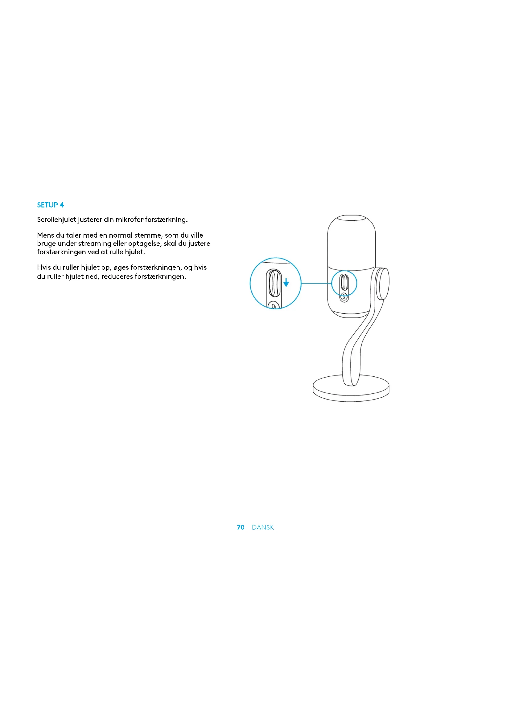 Source SettingsDesktop AudioGlobal SettingsMic/AuxDevice Microophone (2-Yeti GX) 10070 DANSK SETUP 4 Scrollehjulet justerer din mikrofonforstærkning. Mens du taler med en normal stemme, som du ville bruge under streaming eller optagelse, skal du justere forstærkningen ved at rulle hjulet. Hvis du ruller hjulet op, øges forstærkningen, og hvis duruller hjulet ned, reduceres forstærkningen.71 DANSK KONFIGURATION 5 Lyset på scrollehjulet viser også, om mikrofonen er i brug.