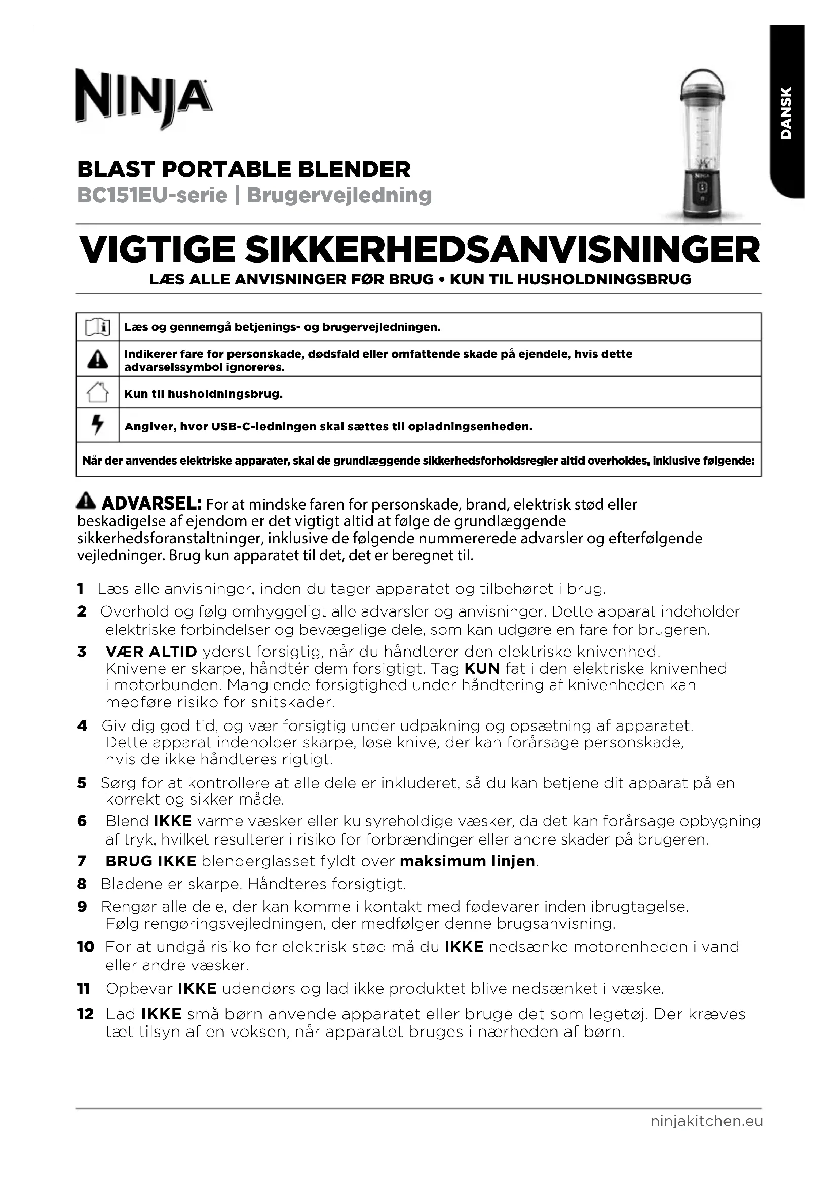 BC151EU-serie | Brugervejledning 1 Læs alle anvisninger, inden du tager apparatet og tilbehøret i brug.2 Overhold og følg omhyggeligt alle advarsler og anvisninger. Dette apparat indeholder elektriske forbindelser og bevægelige dele, som kan udgøre en fare for brugeren. 3 VÆR ALTID yderst forsigtig, når du håndterer den elektriske knivenhed. Kniveneer skarpe, håndtér dem forsigtigt. Tag KUN fat i den elektriske knivenhed i motorbunden. Manglende forsigtighed under håndtering af knivenheden kan medføre risiko for snitskader.4 Giv dig god tid, og vær forsigtig under udpakning og opsætning af apparatet. Detteapparat indeholder skarpe, løse knive, der kan forårsage personskade, hvis de ikke håndteres rigtigt.5 Sørg for at kontrollere at alle dele er inkluderet, så du kan betjene dit apparat på en korrekt og sikker måde. 6 Blend IKKE varme væsker eller kulsyreholdige væsker, da det kan forårsage opbygning af tryk, hvilket resulterer i risiko for forbrændinger eller andre skader på brugeren. 7 BRUG IKKE blenderglasset fyldt over maksimum linjen. 8 Bladene er skarpe. Håndteres forsigtigt.9 Rengør alle dele, der kan komme i kontakt med fødevarer inden ibrugtagelse. Følgrengøringsvejledningen, der medfølger denne brugsanvisning. 10 For at undgå risiko for elektrisk stød må du IKKE nedsænke motorenheden i vand eller andre væsker. 11 Opbevar IKKE udendørs og lad ikke produktet blive nedsænket i væske. 12 Lad IKKE små børn anvende apparatet eller bruge det som legetøj. Der kræves tæt tilsyn af en voksen, når apparatet bruges i nærheden af børn. ADVARSEL: For at mindske faren for personskade, brand, elektrisk stød eller beskadigelse af ejendom er det vigtigt altid at følge de grundlæggende sikkerhedsforanstaltninger, inklusive de følgende nummererede advarsler og efterfølgende vejledninger. Brug kun apparatet til det, det er beregnet til. VIGTIGE SIKKERHEDSANVISNINGER LÆS ALLE ANVISNINGER FØR BRUG • KUN TIL HUSHOLDNINGSBRUGLæs og gennemgå betjenings- og brugervejledningen.Indikerer fare for personskade, dødsfald eller omfattende skade på ejendele, hvis dette advarselssymbolignoreres.Kun til husholdningsbrug.Angiver, hvor USB-C-ledningen skal sættes til opladningsenheden. Når der anvendes elektriske apparater, skal de grundlæggende sikkerhedsforholdsregler altid overholdes, inklusive følgende: DANSKninjakitchen.eu 13 Dette apparat er IKKE beregnet til at blive brugt af personer med nedsatte fysiske og mentale evner, nedsat følesans eller manglende erfaring og viden, medmindre de er under tilsyn af eller instrueres i apparatets anvendelse af en person, der er ansvarlig for deres sikkerhed. 14 Den elektriske knivenhed skal altid kontrolleres for skade inden brug. Hvis en kniv er bøjet eller beskadiget, skal du kontakte SharkNinja for at træe aftale om udskiftning. 15 Forsøg IKKE at slibe bladene.