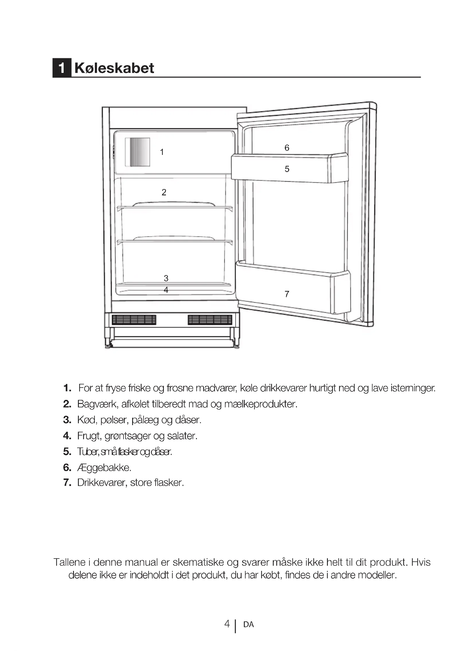 Tallene i denne manual er skematiske og svarer måske ikke helt til dit produkt. Hvis delene ikke er indeholdt i det produkt, du har købt, findes de i andre modeller. 1 Køleskabet