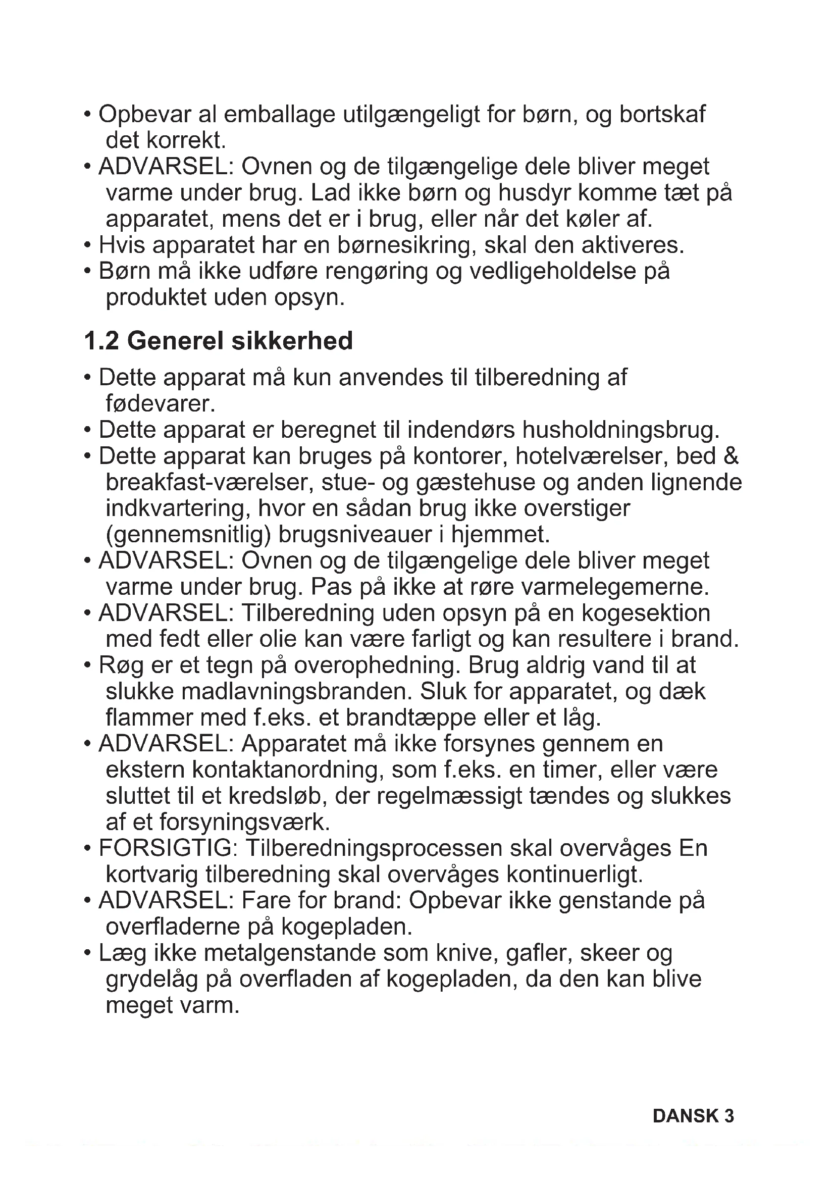 - ADVARSEL: Ovnen og de tilgængelige dele bliver meget varme under brug. Lad ikke børn og husdyr komme tæt på apparatet, mens det er i brug, eller når det køler af.