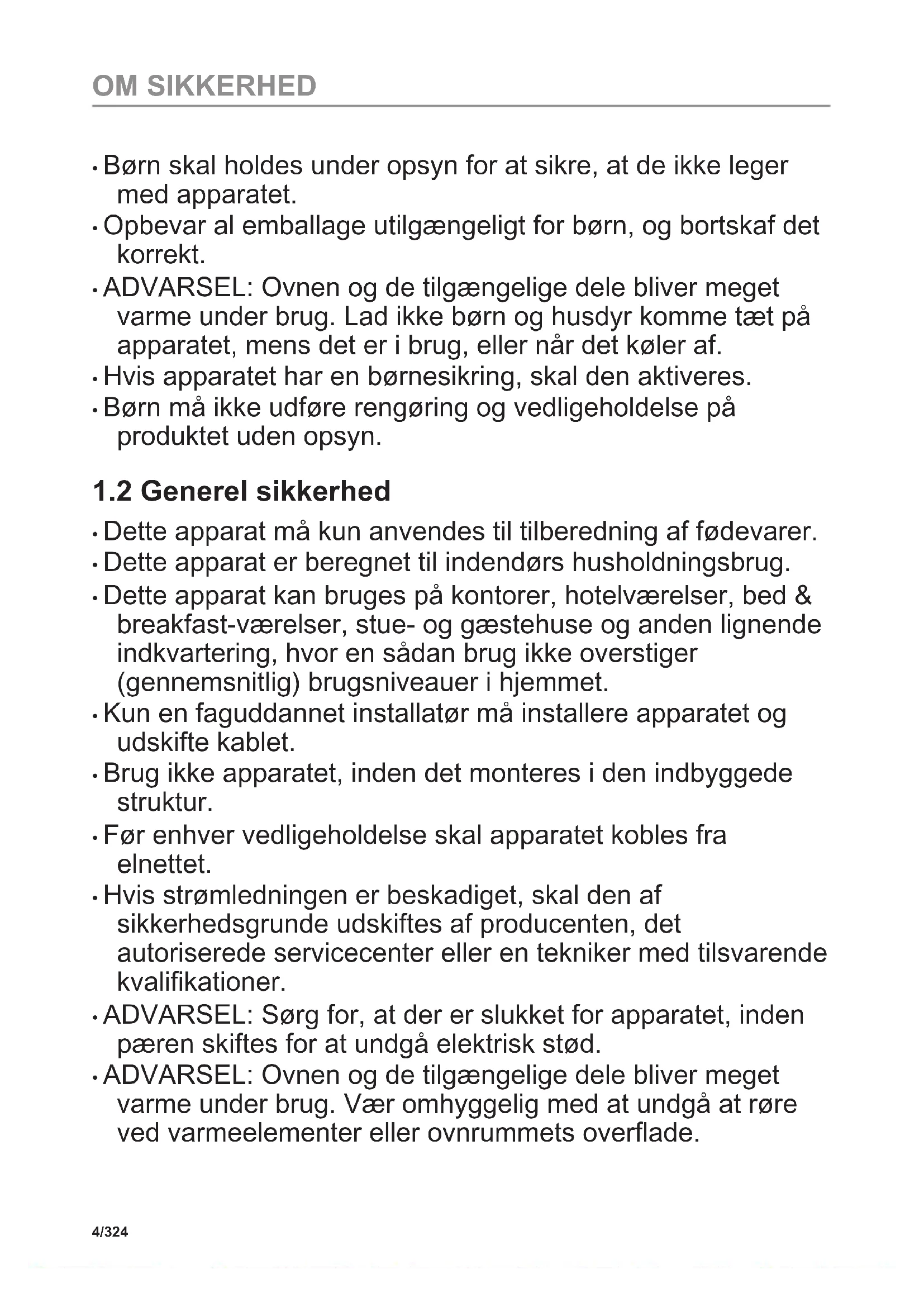 - ADVARSEL: Ovnen og de tilgængelige dele bliver meget varme under brug. Vær omhyggelig med at undgå at røre ved varmeelementer eller ovnrummets overflade. 4/324 OM SIKKERHED• Brug altid ovnhandsker til at fjerne eller isætte tilbehør eller ovnartikler.