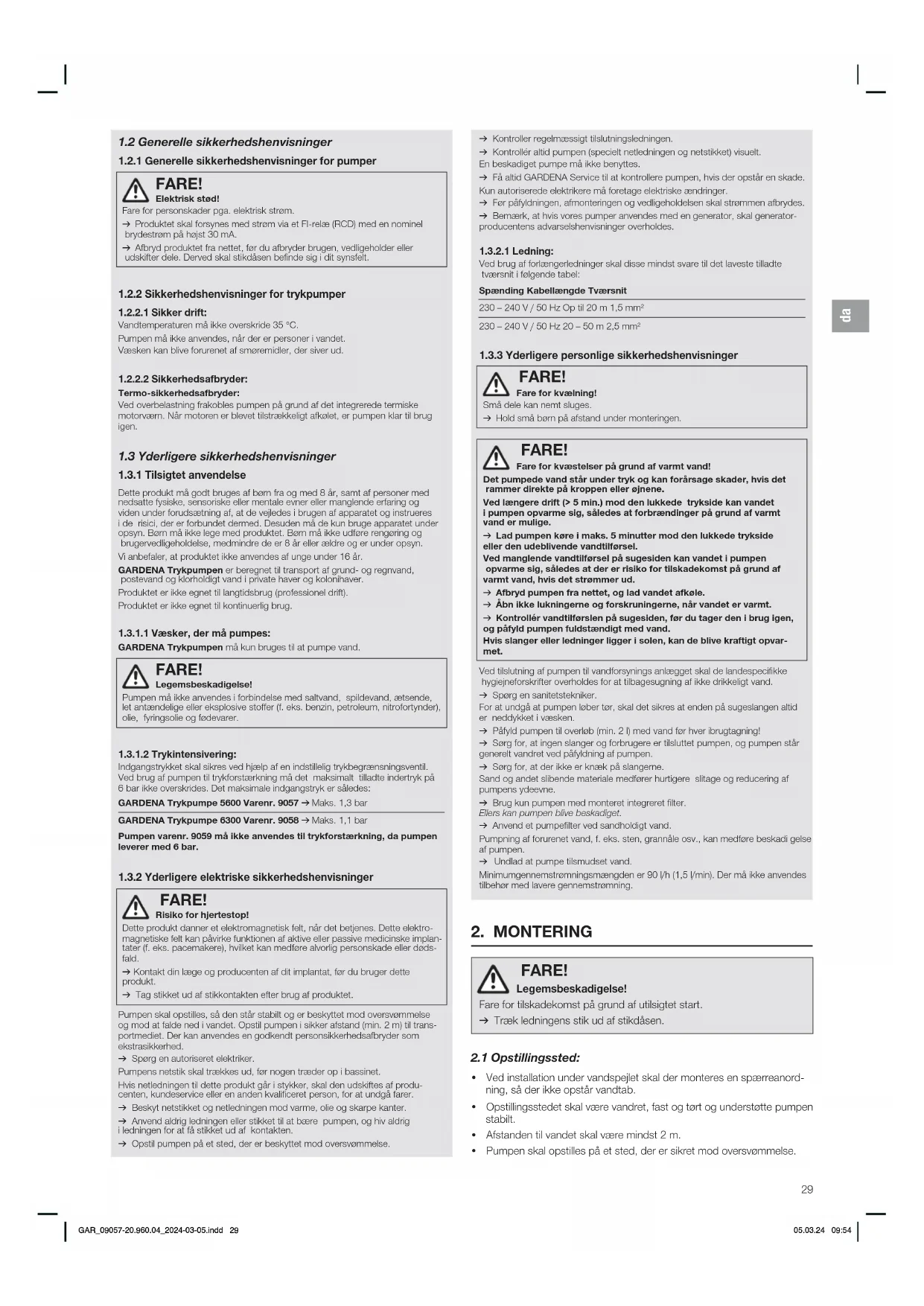 FARE! Risiko for hjertestop!Dette produkt danner et elektromagnetisk felt, når det betjenes. Dette elektro-magnetiske felt kan påvirke funktionen af aktive eller passive medicinske implan-tater (f. eks. pacemakere), hvilket kan medføre alvorlig personskade eller døds-fald. v Kontakt din læge og producenten af dit implantat, før du bruger dette produkt.v Tag stikket ud af stikkontakten efter brug af produktet.Pumpen skal opstilles, så den står stabilt og er beskyttet mod oversvømmelse og mod at falde ned i vandet. Opstil pumpen i sikker afstand (min. 2 m) til trans-portmediet. Der kan anvendes en godkendt personsikkerhedsafbryder som ekstra sikkerhed.v Spørg en autoriseret elektriker.Pumpens netstik skal trækkes ud, før nogen træder op i bassinet.Hvis netledningen til dette produkt går i stykker, skal den udskiftes af produ-centen, kundeservice eller en anden kvalificeret person, for at undgå farer.v Beskyt netstikket og netledningen mod varme, olie og skarpe kanter.v Anvend aldrig ledningen eller stikket til at bære pumpen, og hiv aldrig i ledningen for at få stikket ud af kontakten.v Opstil pumpen på et sted, der er beskyttet mod oversvømmelse.v Kontroller regelmæssigt tilslutningsledningen.v Kontrollér altid pumpen (specielt netledningen og netstikket) visuelt.En beskadiget pumpe må ikke benyttes.v Få altid GARDENA Service til at kontrollere pumpen, hvis der opstår en skade.Kun autoriserede elektrikere må foretage elektriske ændringer.v Før påfyldningen, afmonteringen og vedligeholdelsen skal strømmen afbrydes.v Bemærk, at hvis vores pumper anvendes med en generator, skal generator-producentens advarselshenvisninger overholdes.