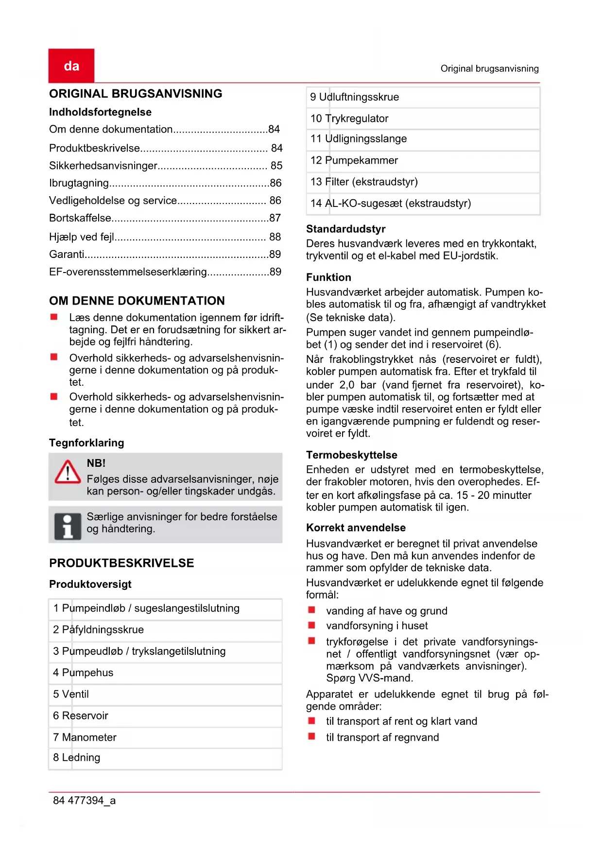 Læs denne dokumentation igennem før idrift- tagning. Det er en forudsætning for sikkert ar- bejde og fejlfri håndtering. Overhold sikkerheds- og advarselshenvisnin- gerne i denne dokumentation og på produk- tet. Overhold sikkerheds- og advarselshenvisnin- gerne i denne dokumentation og på produk- tet. Tegnforklaring NB! Følges disse advarselsanvisninger, nøje kan person- og/eller tingskader undgås. ADVICE Særlige anvisninger for bedre forståelse og håndtering. PRODUKTBESKRIVELSE Produktoversigt 1 Pumpeindløb / sugeslangestilslutning 2 Påfyldningsskrue 3 Pumpeudløb / trykslangetilslutning 4 Pumpehus 5 Ventil 6 Reservoir 7 Manometer 8 Ledning 9 Udluftningsskrue 10 Trykregulator 11 Udligningsslange 12 Pumpekammer 13 Filter (ekstraudstyr) 14 AL-KO-sugesæt (ekstraudstyr) Standardudstyr Deres husvandværk leveres med en trykkontakt, trykventil og et el-kabel med EU-jordstik. Funktion Husvandværket arbejder automatisk. Pumpen ko- bles automatisk til og fra, afhængigt af vandtrykket (Se tekniske data). Pumpen suger vandet ind gennem pumpeindlø- bet (1) og sender det ind i reservoiret (6). Når frakoblingstrykket nås (reservoiret er fuldt), kobler pumpen automatisk fra. Efter et trykfald til under 2,0 bar (vand fjernet fra reservoiret), ko- bler pumpen automatisk til, og fortsætter med at pumpe væske indtil reservoiret enten er fyldt eller en igangværende pumpning er fuldendt og reser- voiret er fyldt. Termobeskyttelse Enheden er udstyret med en termobeskyttelse, der frakobler motoren, hvis den overophedes. Ef- ter en kort afkølingsfase på ca. 15 - 20 minutter kobler pumpen automatisk til igen. Korrekt anvendelse Husvandværket er beregnet til privat anvendelse hus og have. Den må kun anvendes indenfor de rammer som opfylder de tekniske data. Husvandværket er udelukkende egnet til følgende formål: vanding af have og grund vandforsyning i huset trykforøgelse i det private vandforsynings- net / offentligt vandforsyningsnet (vær op- mærksom på vandværkets anvisninger). Spørg VVS-mand. Apparatet er udelukkende egnet til brug på føl- gende områder: til transport af rent og klart vand til transport af regnvandProduktbeskrivelse 477394_a 85 Mulig fejlanvendelse Pumpen må ikke anvendes til vedvarende drift. Den er desuden ikke egnet til pumpning af føl- gende: drikkevand saltvand levnedsmidler aggressive kemikalier ætsende, brandbare, eksplosive eller flygtige væsker væsker, som er varmere end 35 °C sandholdigt vand og slibende/grovkornede stoffer SIKKERHEDSANVISNINGER NB! Pumpeautomaten må kun tilsluttes elek- triske installationer, som opfylder DIN/ VDE 0100, del 737, 738 og 702 (swim- mingpools, havebassiner). Pumpen må kun tilsluttes til forskriftsmæssig instal- leret sikkerhedskontakt. Sikring mindst 10 A. Desuden skal der være installeret et fejlstrømsrelæ med udløserstrøm på 10/30 mA. NB! Oplysningerne vedrørende netspænding og strømtype på pumpens mærkeplade skal passe med de data, der er oplyst for dit strømforsyningsnet. NB! Anvend kun forlængerledninger på 3 x 1,5 mm² af kvaliteten H07RN-F i hen- hold til DIN 57282/57245 med stænk- vandsbeskyttet stik. Kabeltromler skal altid være rullet helt ud. NB! Enhver form for ændring eller ombygning af pumpen er forbudt. NB! Beskadigede apparater må ikke anven- des. Reparationer må kun udføres af vores serviceafdeling. NB! Enheden må aldrig løftes i, transporte- res, eller fastgøres med netledningen. Anvend ikke ledningen til at trække stik- ket ud af kontakten. NB! Fjern altid stikket fra kontakten når pum- pen efterses og ved driftsforstyrrelser. Beskyt stikket imod fugt. NB! Enheden må kun anvendes efter bestemmelserne. Før pumpen tages i brug vær da sikker på, at pumpeautomat, reservoir, netled- ning og stikkontakt ikke er beskadi- get. NB! Fare for kvæstelse pga. varmt vand! Ved lćngere tids drift (> 10 min) mod den lukkede trykside kan vandet blive kraftigt opvarmet i pumpen. Denne fare kan opstå ved: lukket trykside vandmangel i sugeledningen ukorrekt installation defekt trykafbryder I dette tilfælde: Adskil pumpen fra nettet Lad pumpe og vand afkøle Kontrollér vandniveauet på sugesi den Kontrollér ledningerne for tæthed Kontrollér installationen Kontrollér trykafbryderen Tag først pumpen i drift igen efter fej lafhjælpningen Børn og andre personer, der ikke har kends- kab til brugsanvisningen, må ikke anvende maskinen.da Ibrugtagning 86 477394_a IBRUGTAGNING NB! Udsæt ikke apparatet for mekanisk tryk eller ryk når suge- og trykslangerne mon- teres. Suge-slangen og trykslangen skal anbringes således, at de ikke udøver et mekanisk tryk på pumpen og trykbehol- deren. Vi anbefaler, at der monteres et stykke flexslange ved såvel sugeslan- gen (1) som trykslangen (3). Hvis de har spørgsmål hertil, kontakt forhandleren. NB! Ved automatisk drift skal der foretages de nødvendige forholdsregler, så der ikke kan ske yderligere skader, forårsa- get af en eventuel over-svømmelse, hvis pumpen skulle sætte ud. Dette kan f.eks. ske ved at installere et alarmanlæg eller en reservepumpe. ADVICE Før ibrugtagning skal membranfortrykket (indløbstryk) i ventilen (5) i reservoiret ef- terses. Trykket skal være ca. 1,5 bar, og korrige- res om nødvendigt (se “kontrol af mem- bran-fortrykket”). Husvandværket sættes på et fast, plant og vandret underlag. Vær desuden opmærksom på at husvand- værket skal beskyttes mod regn eller direkte vandstråle. Montering af sugeslange NB! En tilstrækkelig lang slange vælges, så- ledes at apparatet ikke suger luft og der- med løber tør. Slangen skal ligge mindst 30 cm under vandoverfladen i væsken, som skal pumpes. ADVICE Ved en opsugningsdybde på mere end 4 m bør der anvendes en sugeslange med en diameter større end 1”. Desuden anbefaler vi at anvende AL-KO-suges- langesæt (14) komplet med kontraventil. Spørg forhandleren. ADVICE Hvis sugeslangen placeres højere end pumpen, vil der dannes luftbobler i s