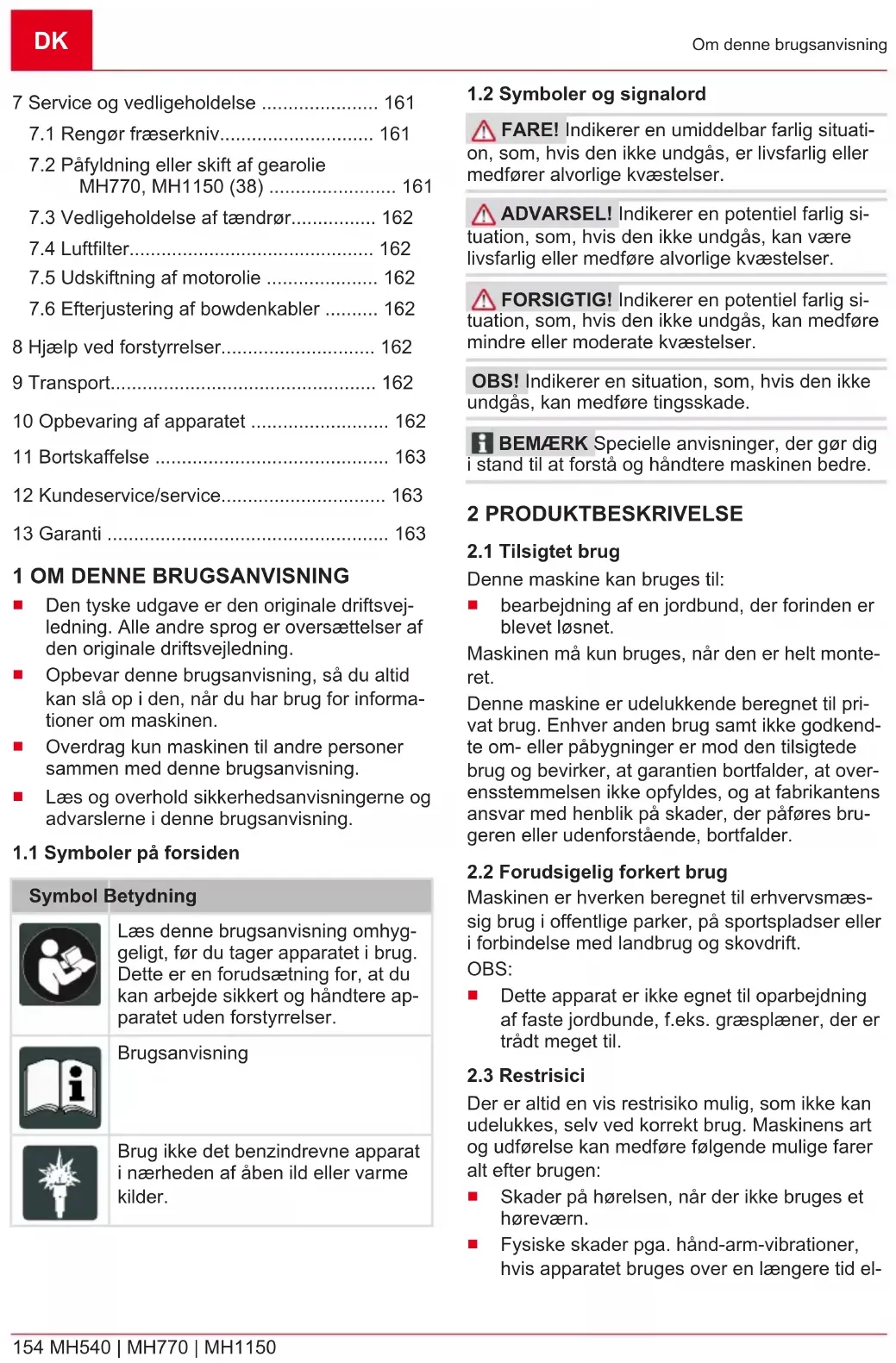 Produktoversigten (01, 09, 18) giver et overblik over maskinen. Nr. Komponent 1 Koblingshåndtag 2 Håndtag 3 Håndtag til gearvalg 4 Motor 5 Transporthjul 6 Fræserknive 7 Beskyttelsesskiver 8 BeskyttelsesskærmDK 156 MH540 | MH770 | MH1150 Sikkerhedsanvisninger Nr. Komponent 9 Jordspyd 10 Gashåndtag 11 Håndtag til bakgear 12 Motorafbryder 3 SIKKERHEDSANVISNINGER FARE! Livsfare samt fare for alvorlige kvæstelser! Manglende kendskab til sikkerheds- anvisningerne og betjeningsanvisningerne kan medføre meget alvorlige kvæstelser samt være livsfarlige.