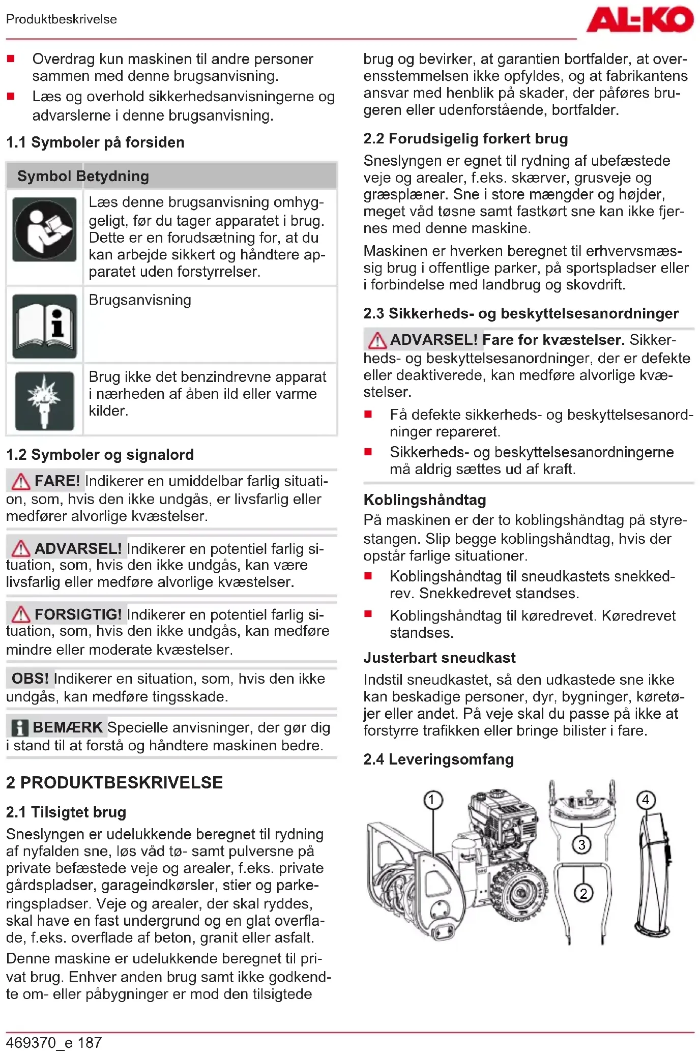Produktoversigten (01) giver et overblik over ma- skinen. Nr. Del 1 Opvarmede håndtag 2 Koblingsdrev til snekkedrevet 3 Koblingshåndtag til køredrevet 4 Håndsving til justering af udkastretnin- gen 5 Håndtag til styring af udkasthøjden 6 Gearskifter, 6 fremadgående gear og 2 bakgear 7 Knap til håndtagenes varme 8 Ekstra knækbolte 9 Deflektor på sneudkastet til indstilling af udkasthøjden 10 Sneudkast med håndbeskyttelse 11 Belysning 12 Tankdæksel 13 Oliepåfyldningsdæksel 14 Skjold 15 Rengøringsværktøj (fastgjort på skjol- det) 16 Kastehjul 17 Transportsnekke 18 Ryddeplade 19 Højdejusterbare glideskinner 20 Tændrørsstik 3 SIKKERHEDSANVISNINGER FARE! Livsfare samt fare for alvorlige kvæstelser! Manglende kendskab til sikkerheds- anvisningerne og betjeningsanvisningerne kan medføre meget alvorlige kvæstelser samt være livsfarlige.