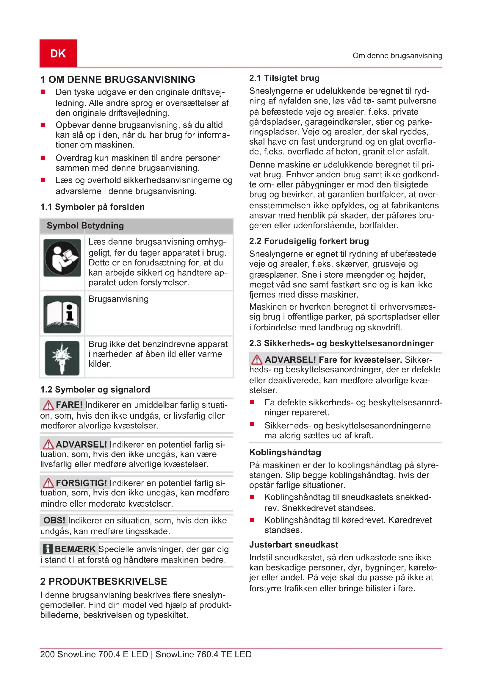 Symbol Betydning OBS! Vær særligt forsigtig under håndte- ringen! Læs betjeningsvejledningen før brug! Kom ikke tæt på udkastområdet. Fare på grund af sneudkast. Bær øjenbeskyttelse og høreværn! Grib ikke ind i roterende dele. Fare for at blive trukket ind! Stik ikke hænderne ind i sneudka- stet! Stik ikke hænderne ind i og træd ik- ke på snekken! Sluk motoren inden alle former for arbejde på maskinen. Træk tændrørsstikket ud før vedli- geholdelses- og reparationsarbejde. Hold uvedkommende væk fra fare- området! Roterende dele i udkastområdet! Fare for at blive trukket ind!DK 202 SnowLine 700.4 E LED | SnowLine 760.4 TE LED Produktbeskrivelse