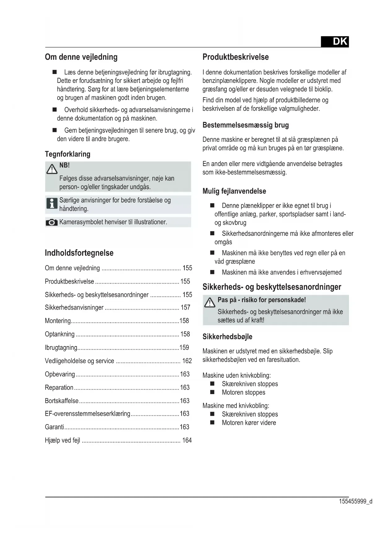 - Ellenőrizze a fűnyíró kést Olyan hibák esetén, amelyek nem szerepelnek a táblázatban, illetve amelyeket saját maga nem tud elhárítani, forduljon illetékes ügyfélszolgálatunkhoz.DK 155455999_d Indholdsfortegnelse Om denne vejledning ................................................. 155 Produktbeskrivelse .................................................... 155 Sikkerheds- og beskyttelsesanordninger ................... 155 Sikkerhedsanvisninger .............................................. 157 Montering ................................................................... 158 Optankning ................................................................ 158 Ibrugtagning ............................................................... 159 Vedligeholdelse og service ........................................ 162 Opbevaring ................................................................ 163 Reparation ................................................................. 163 Bortskaffelse .............................................................. 163 EF-overensstemmelseserklæring .............................. 163 Garanti ....................................................................... 163 Hjælp ved fejl ............................................................. 164 Om denne vejledning Læs denne betjeningsvejledning før ibrugtagning. Dette er forudsætning for sikkert arbejde og fejlfri håndtering. Sørg for at lære betjeningselementerne og brugen af maskinen godt inden brugen. Overhold sikkerheds- og advarselsanvisningerne i denne dokumentation og på maskinen. Gem betjeningsvejledningen til senere brug, og giv den videre til andre brugere. Tegnforklaring NB! Følges disse advarselsanvisninger, nøje kan person- og/eller tingskader undgås. Særlige anvisninger for bedre forståelse og håndtering. Kamerasymbolet henviser til illustrationer. Produktbeskrivelse I denne dokumentation beskrives forskellige modeller af benzinplæneklippere. Nogle modeller er udstyret med græsfang og/eller er desuden velegnede til bioklip. Find din model ved hjælp af produktbillederne og beskrivelsen af de forskellige valgmuligheder. Bestemmelsesmæssig brug Denne maskine er beregnet til at slå græsplænen på privat område og må kun bruges på en tør græsplæne. En anden eller mere vidtgående anvendelse betragtes som ikke-bestemmelsesmæssig. Mulig fejlanvendelse Denne plæneklipper er ikke egnet til brug i offentlige anlæg, parker, sportspladser samt i land- og skovbrug Sikkerhedsanordningerne må ikke afmonteres eller omgås Maskinen må ikke benyttes ved regn eller på en våd græsplæne Maskinen må ikke anvendes i erhvervsøjemed Sikkerheds- og beskyttelsesanordninger Pas på - risiko for personskade! Sikkerheds- og beskyttelsesanordninger må ikke sættes ud af kraft! Sikkerhedsbøjle Maskinen er udstyret med en sikkerhedsbøjle. Slip sikkerhedsbøjlen ved en faresituation. Maskine uden knivkobling: Skærekniven stoppes Motoren stoppes Maskine med knivkobling: Skærekniven stoppes Motoren kører videreDK Oversættelse af original brugsanvisning Benzinplæneklipper1 Startsnor 10 Variogear*2 Hjuldrev* 11 Brugsvejledning3 Sikkerhedsbøjle 12 Udkastelement*4 Ergonomisk højdeindstilling* 13 Lukkeklap*5 Benzinstandsvisning* 14 Biosæt*6 Prelklap 15 Tænding Elektrisk start*7 Græsfang 16 Kort brugsanvisning8 Indstilling af klippehøjde 17 Fastgasindstilling*9 Knivkobling* * alt efter udførelseSymboler på maskinen NB! Særlig forsigtighed ved håndtering.Træk stikket til tændrøret ud, før du arbejder på skæret.Læs brugsanvisningen før ibrugtagning!STARTTænding Elektrisk start:Tag tændingsnøglen ud før vedligehol-delses- og reparationsarbejde!Hold uvedkommende væk fra fareområdet!Kort brugsanvisningLøsn motordremsen.Hold hænder og fødder væk fra skæreværket!Kort brugsanvisningKobl hjuldrevet til. Hold afstand til fareområdet.Kort brugsanvisningFastgasindstilling Start / Stop.