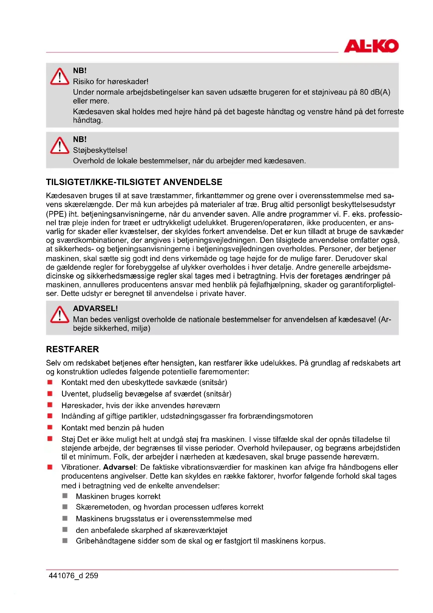 (2000/14/ EC+2005/88/EC) 112 dB(A) 113 dB(A)da Garanti 280 BKS 3835 / BKS 4040 GARANTI Evt. fejl i materiale- eller fabrikationsfejl på maskinen udbedres eller erstattes inden for garantiperioden uden beregning af en reparatør, som vi udpeger. Garantiperioden bestemmes af lovgivningen i det land, hvor maskinen er købt. Garantien gælder kun, hvis maskinen behandles kyndigt, forskrifterne i betjeningsvejledningen overhol- des, der anvendes originale reservedele Garantien bortfalder, hvis maskinen forsøges repareret egenhændigt, der udføres tekniske ændringer på maskinen, maskinen anvendes mod sin bestemmelse (f.eks. erhvervsmæssig eller kommunal anven- delse). Garantien omfatter ikke: Lakskader, der opstår som følge af normal anvendelse Sliddele, der på reservedelskortet er markeret med [xxx xxx (x)] Forbrændingsmotorer - ved forbrændingsmotorer gælder den pågældende motorproducents sepa- rate garantibestemmelser Garantiperioden begynder ved den første slutbrugers køb. Her gælder datoen på den originale kvittering. Ved garantikrav bedes du medbringe dette garantibevis sammen med den originale kvittering for købet til din forhandler eller det nærmeste autoriserede kundecenter. Garantien forbliver uændret ved evt. salg til tredjepart. EU-OVERENSSTEMMELSESERKLÆRING Vi erklærer herved, at dette markedsførte produkt opfylder kravene i de harmoniserede EU-direktiver, EU-sikkerhedsstandarder og pro- duktspecifikke standarder. Produkt Producent CEO Kædesav Serienummer G4104105 AL-KO Geräte GmbH Ichenhauser Str. 14 D-89359 Kötz Andreas Hedrich Ichenhauser Str. 14 D-89359 Kötz Model EU-direktiver Harmoniserede standarder BKS 3835 BKS 4040 Lydtrykniveau EN ISO 3744 målt/garanteret BKS 3835 - 108 / 112 dB(A) BKS 4040 - 110 / 113 dB(A) 2006/42/EG 2014/30/EU 2000/14/EG