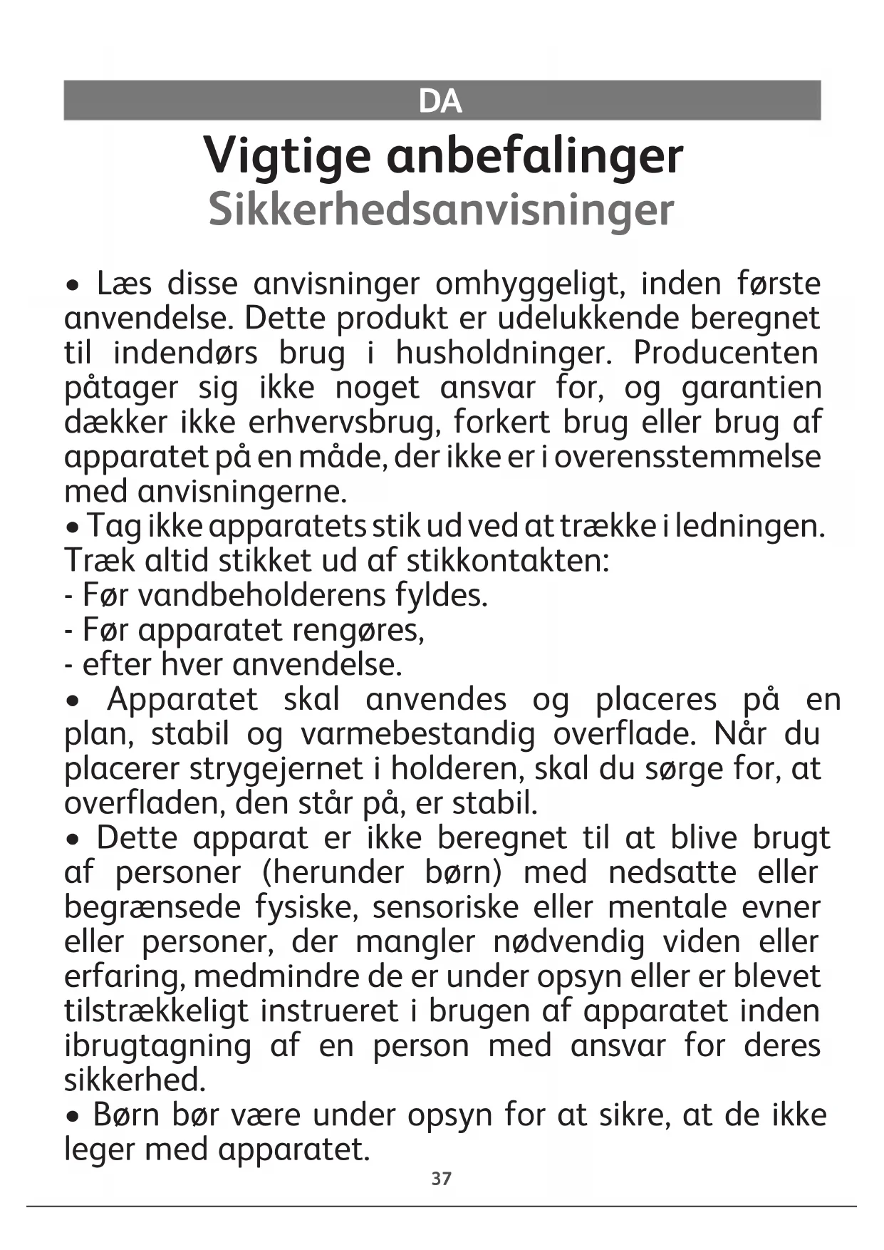 - Apparatet kan bruges af børn på 8 år eller derover, af personer, der mangler nødvendig viden eller erfaring, samt af personer med nedsatte eller begrænsede fysiske, sensoriske eller mentale evner, hvis de har modtaget grundig instruktion i brugen af apparatet, hvis de er under opsyn, og hvis de forstår de risici, som brugen af apparatet omfatter. Børn må ikke lege med apparatet. Rengøring og vedligeholdelse må ikke udføres af børn, hvis de ikke er under opsyn. Hold strygejernet og det tilhørende kabel væk fra børn under 8 år, når det varmer op eller køler af.