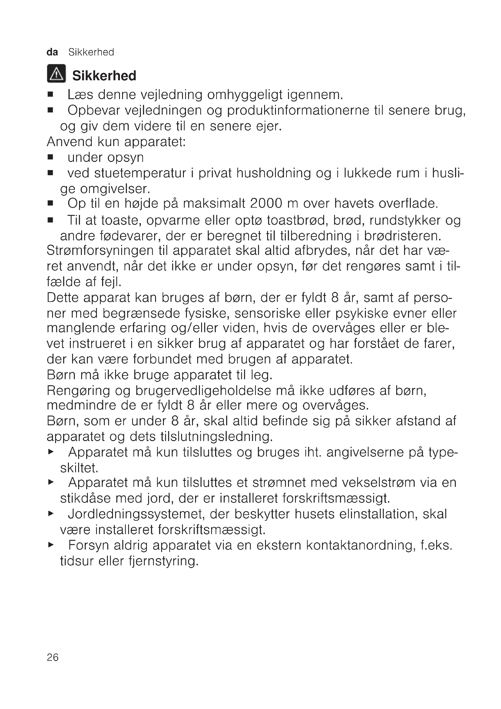 Sikkerhed ¡ Læs denne vejledning omhyggeligt igennem. ¡ Opbevar vejledningen og produktinformationerne til senere brug, og giv dem videre til en senere ejer. Anvend kun apparatet: ¡ under opsyn ¡ ved stuetemperatur i privat husholdning og i lukkede rum i husli- ge omgivelser. ¡ Op til en højde på maksimalt 2000m over havets overflade. ¡ Til at toaste, opvarme eller optø toastbrød, brød, rundstykker og andre fødevarer, der er beregnet til tilberedning i brødristeren. Strømforsyningen til apparatet skal altid afbrydes, når det har væ- ret anvendt, når det ikke er under opsyn, før det rengøres samt i til- fælde af fejl. Dette apparat kan bruges af børn, der er fyldt 8 år, samt af perso- ner med begrænsede fysiske, sensoriske eller psykiske evner eller manglende erfaring og/eller viden, hvis de overvåges eller er ble- vet instrueret i en sikker brug af apparatet og har forstået de farer, der kan være forbundet med brugen af apparatet. Børn må ikke bruge apparatet til leg. Rengøring og brugervedligeholdelse må ikke udføres af børn, medmindre de er fyldt 8 år eller mere og overvåges. Børn, som er under 8 år, skal altid befinde sig på sikker afstand af apparatet og dets tilslutningsledning. ▶ Apparatet må kun tilsluttes og bruges iht. angivelserne på type- skiltet. ▶ Apparatet må kun tilsluttes et strømnet med vekselstrøm via en stikdåse med jord, der er installeret forskriftsmæssigt. ▶ Jordledningssystemet, der beskytter husets elinstallation, skal være installeret forskriftsmæssigt. ▶ Forsyn aldrig apparatet via en ekstern kontaktanordning, f.eks. tidsur eller fjernstyring.Sikkerhed da