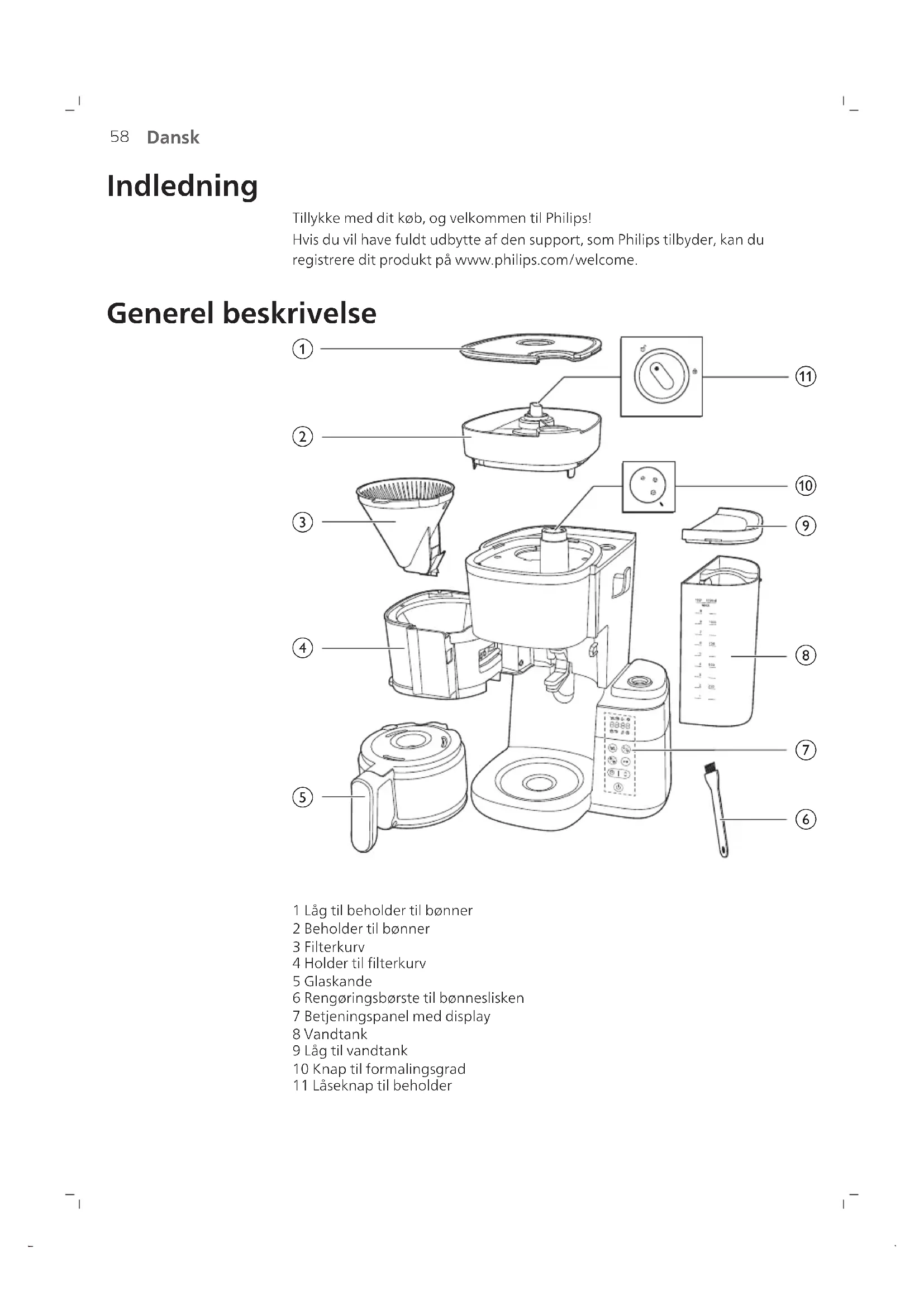 Dansk Indledning Tillykke med dit køb, og velkommen til Philips! Hvis du vil have fuldt udbytte af den support, som Philips tilbyder, kan du registrere dit produkt på www.philips.com/welcome. Generel beskrivelse