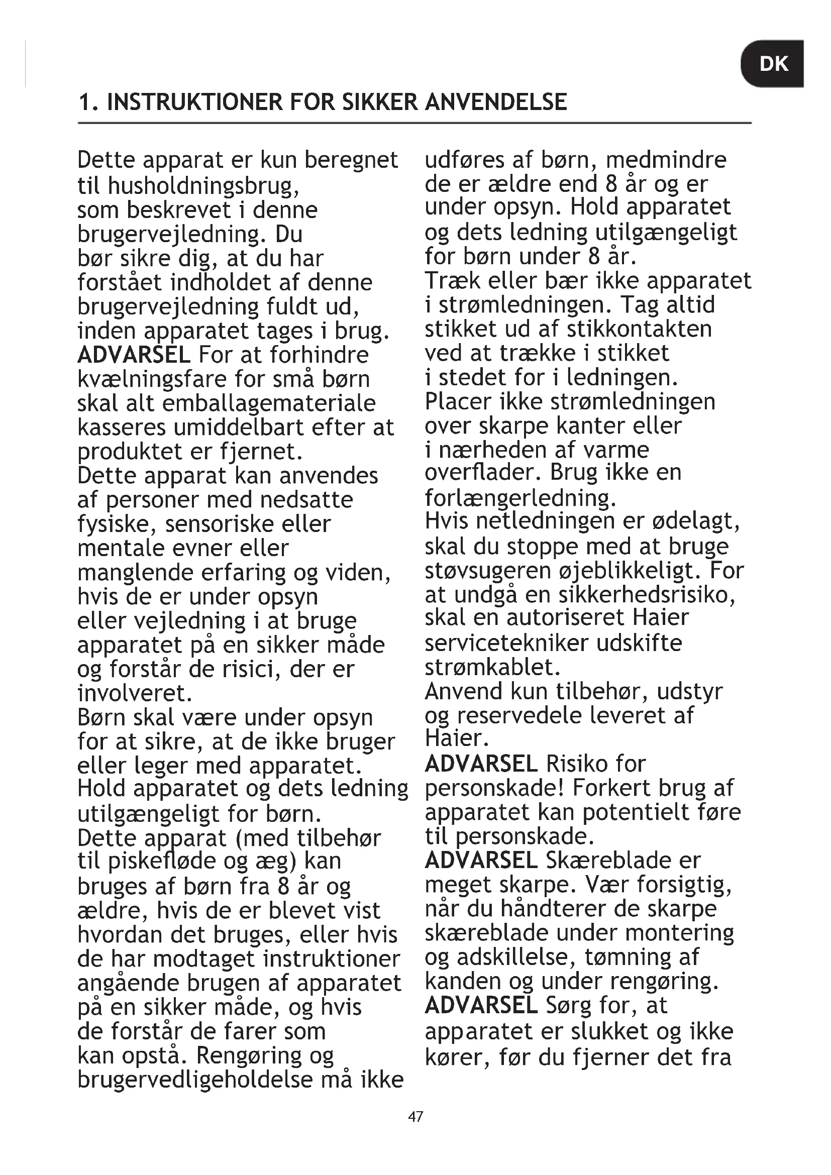 il husholdningsbrug, som beskrevet i denne brugervejledning. Du bør sikre dig, at du har forstået indholdet af denne brugervejledning fuldt ud, inden apparatet tages i brug. ADVARSEL For at forhindre kvælningsfare for små børn skal alt emballagemateriale kasseres umiddelbart efter at produktet er fjernet. Dette apparat kan anvendes af personer med nedsatte fysiske, sensoriske eller mentale evner eller manglende erfaring og viden, hvis de er under opsyn eller vejledning i at bruge apparatet på en sikker måde og forstår de risici, der er involveret. Børn skal være under opsyn for at sikre, at de ikke bruger eller leger med apparatet. Hold apparatet og dets ledning utilgængeligt for børn. Dette apparat (med tilbehør til piskeøde og æg) kan bruges af børn fra 8 år og ældre, hvis de er blevet vist hvordan det bruges, eller hvis de har modtaget instruktioner angående brugen af apparatet på en sikker måde, og hvis de forstår de farer som kan opstå. Rengøring og brugervedligeholdelse må ikke udføres af børn, medmindre de er ældre end 8 år og er under opsyn. Hold apparatet og dets ledning utilgængeligt for børn under 8 år. Træk eller bær ikke apparatet i strømledningen. Tag altid stikket ud af stikkontakten ved at trække i stikket i stedet for i ledningen. Placer ikke strømledningen over skarpe kanter eller i nærheden af varme overader. Brug ikke en forlængerledning. Hvis netledningen er ødelagt, skal du stoppe med at bruge støvsugeren øjeblikkeligt. For at undgå en sikkerhedsrisiko, skal en autoriseret Haier servicetekniker udskifte strømkablet. Anvend kun tilbehør, udstyr og reservedele leveret af Haier. ADVARSEL Risiko for personskade! Forkert brug af apparatet kan potentielt føre til personskade. ADVARSEL Skæreblade er meget skarpe. Vær forsigtig, når du håndterer de skarpe skæreblade under montering og adskillelse, tømning af kanden og under rengøring. ADVARSEL Sørg for, at app aratet er slukket og ikke kører, før du fjerner det fra
