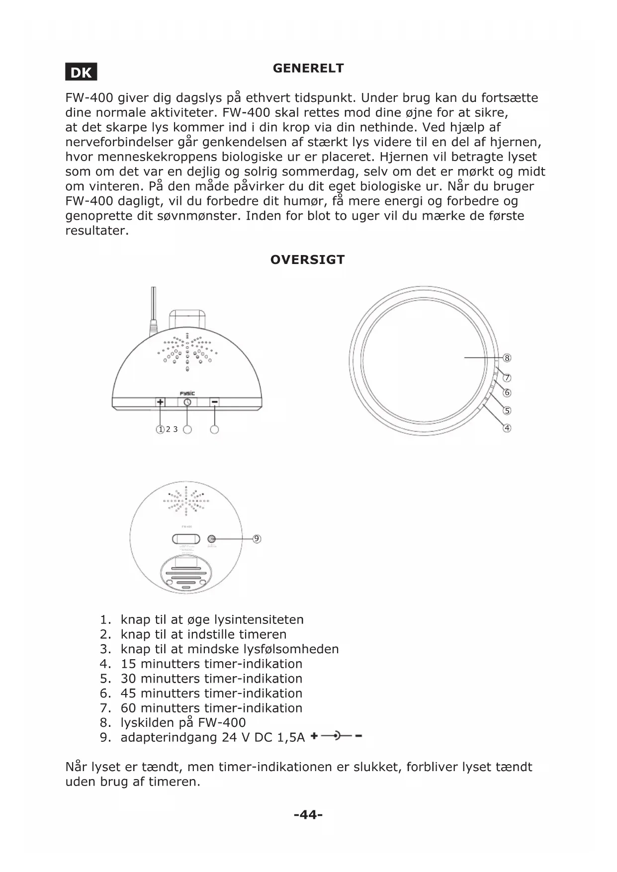 - Användning på morgonen rekommenderas, då användning på morgonen är mer gynnsamt än vid andra tillfällen.-44- GENERELT FW-400 giver dig dagslys på ethvert tidspunkt. Under brug kan du fortsætte dine normale aktiviteter. FW-400 skal rettes mod dine øjne for at sikre, at det skarpe lys kommer ind i din krop via din nethinde. Ved hjælp af nerveforbindelser går genkendelsen af stærkt lys videre til en del af hjernen, hvor menneskekroppens biologiske ur er placeret. Hjernen vil betragte lyset som om det var en dejlig og solrig sommerdag, selv om det er mørkt og midt om vinteren. På den måde påvirker du dit eget biologiske ur. Når du bruger FW-400 dagligt, vil du forbedre dit humør, få mere energi og forbedre og genoprette dit søvnmønster. Inden for blot to uger vil du mærke de første resultater. OVERSIGT 24V 1,5A Hesdo bv. Azielaan 12, 5232BA ‘s-Hertogenbosch The Netherlands www.fysic.com FW-400