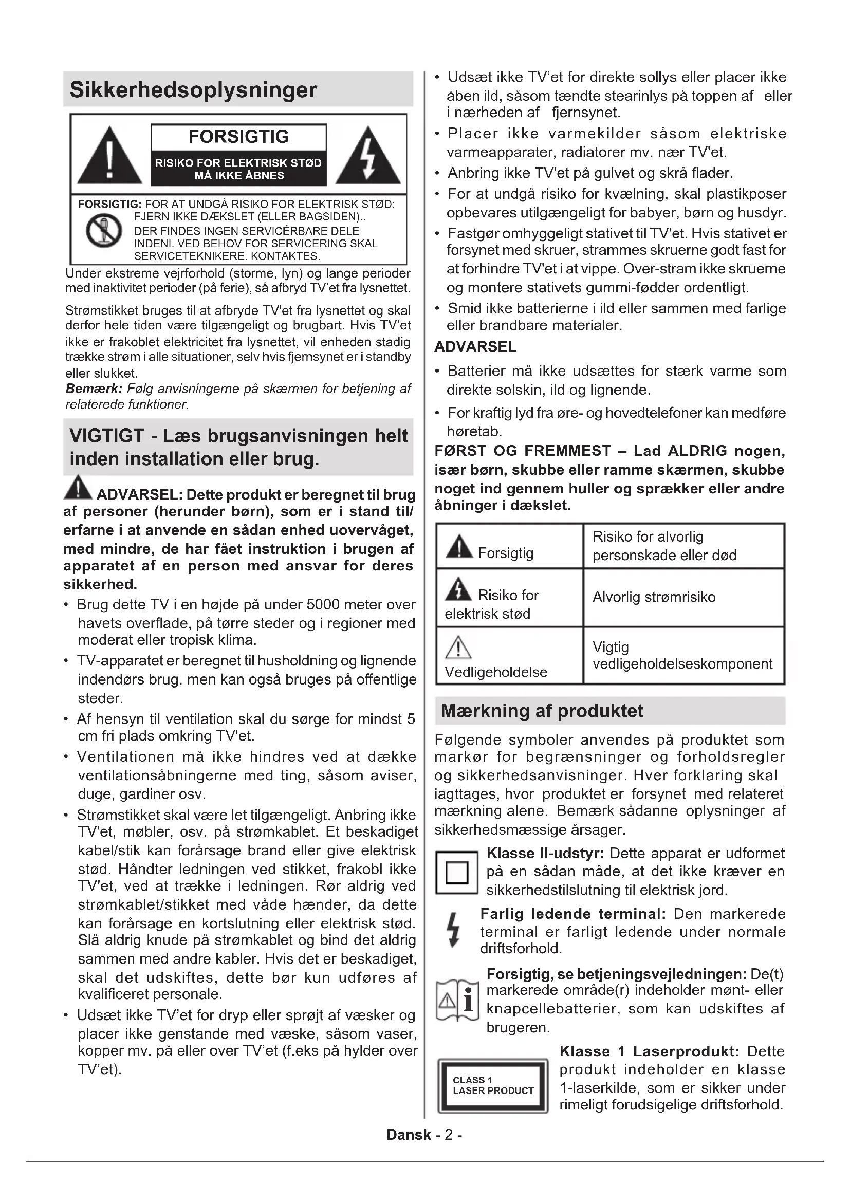 - Udstyret passer kun til montering i højder på ≤ 2m. Hvis dit nuværende TV er ved at blive afmonteret og yttet, bør de samme overvejelser som ovenfor anvendes. – – – – – – – – – – – – Apparater forbundet til bygningsinstallationernes beskyttende jordforbindelse gennem LYSNETTET eller gennem andet apparat med beskyttende jordfor- bindelse – og til et TV-distributionssystem ved brug af koaksialkabel, kan under visse omstændigheder være brandfarligt. Tilslutning til et kabelfordelersystem skal derfor foretages gennem en anordning, der giver elektrisk isolation under et bestemt frekvensområde (galvanisk isolator)..