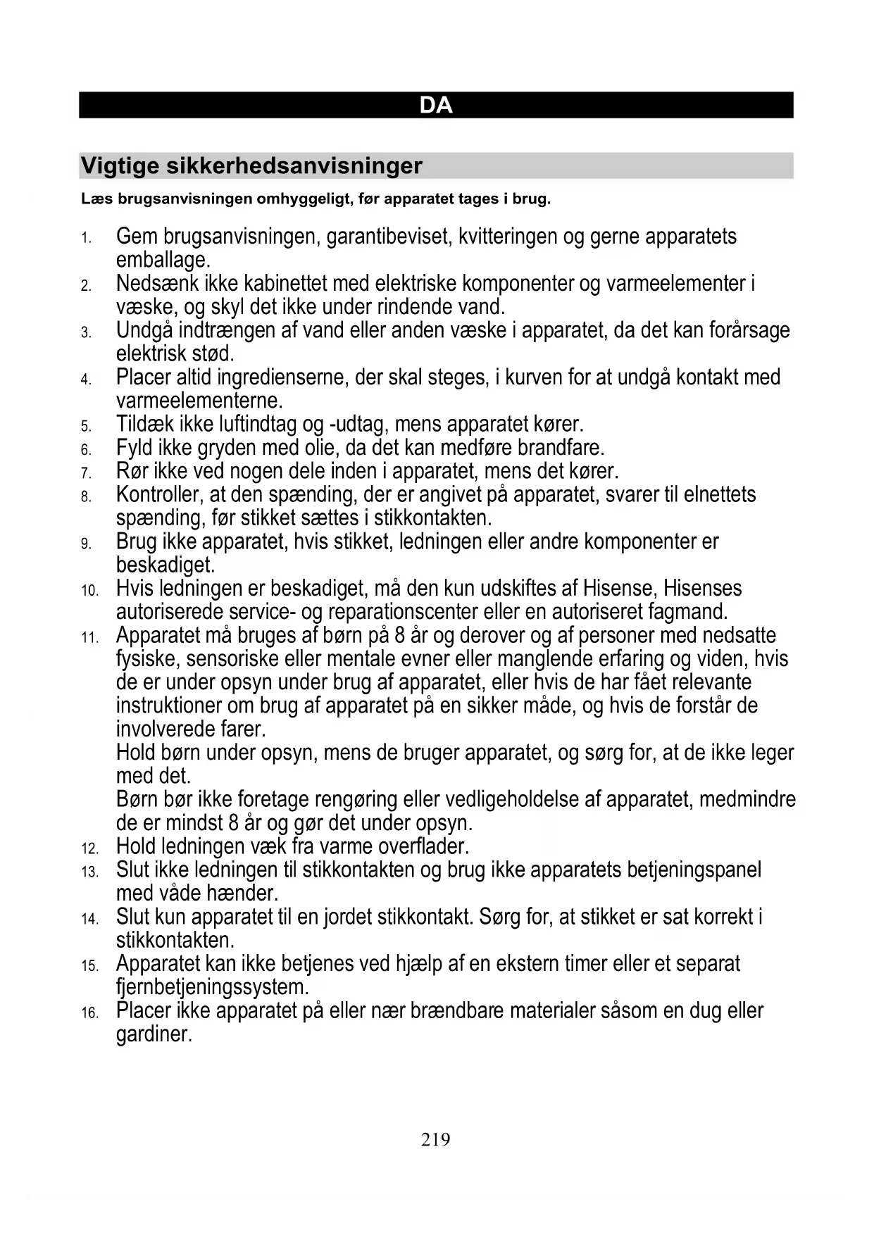 Hvis du ønsker information om eller har et problem med dit apparat, kan du kontakte Hisense kundecenter i dit land (du finder telefonnummeret i det globale garantihæfte). Hvis der ikke er et kundecenter i dit land, skal du kontakte din lokale Hisense -forhandler eller Hisense servicenetværk. Kun til brug i private husholdninger! VI ØNSKER DIG GOD FORNØJELSE MED DENNE HISENSE AIRFRYER! Vi forbeholder os ret til at foretage ændringer!231