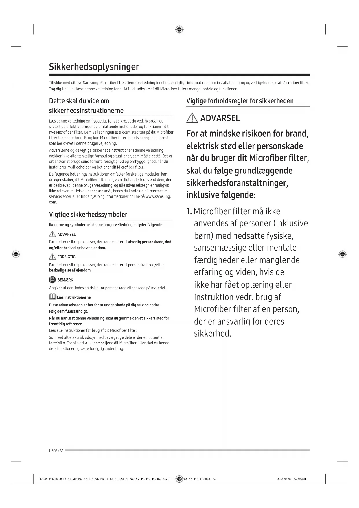 anvendes af personer (inklusive børn) med nedsatte fysiske, sansemæssige eller mentale færdigheder eller manglende erfaring og viden, hvis de ikke har fået oplæring eller instruktion vedr. brug af Microfiber filter af en person, der er ansvarlig for deres sikkerhed. DC68-04471B-00_IB_FT-MF_EU_EN_DE_NL_FR_IT_ES_PT_DA_FI_NO_SV_PL_HU_EL_RO_BG_LT_LV_ET_CS_SK_HR_TR.indb 72 2023-06-07 5:52:51Dansk 73