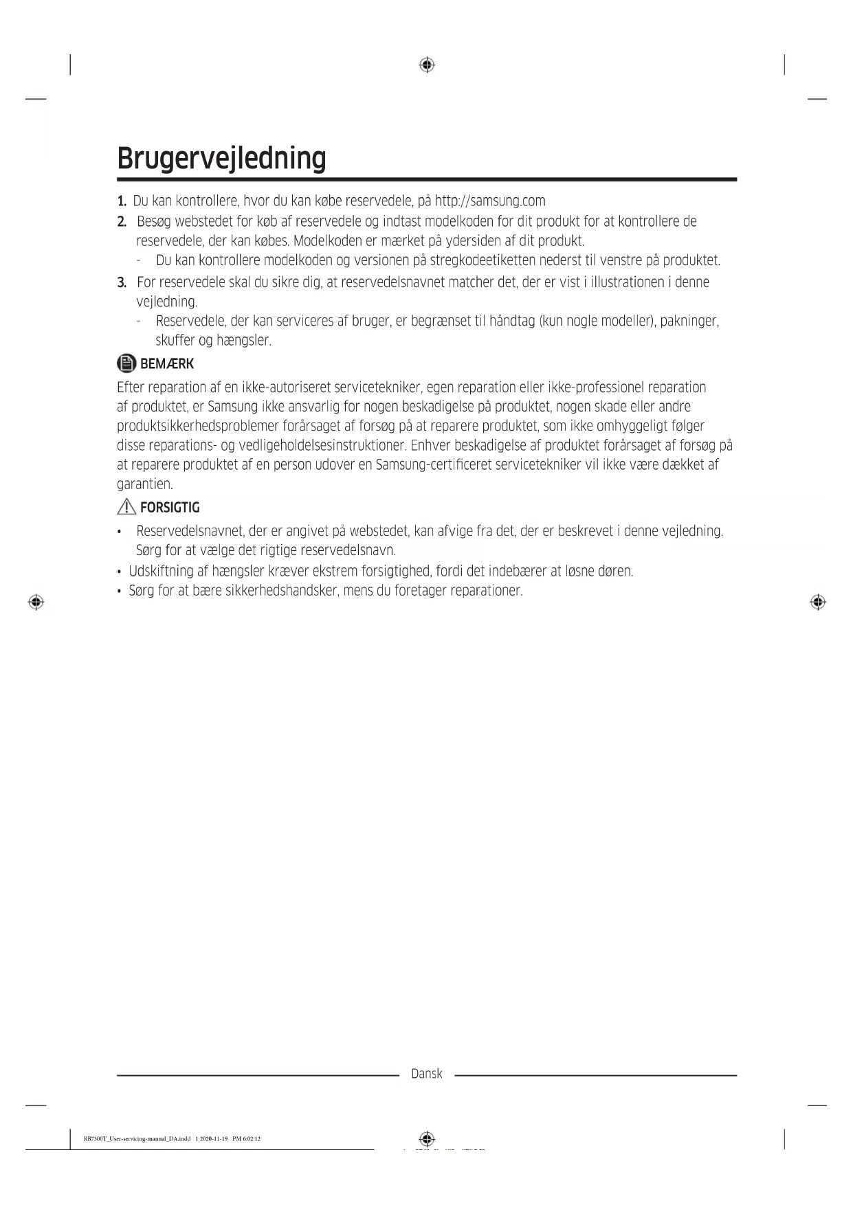 - Sørg for at bære sikkerhedshandsker, mens du foretager reparationer. RB7300T_User-servicing-manual_DA.indd 1 2020-11-19 PM 6:02:12Dansk Det faktiske billede og køleskabets medfølgende dele afviger muligvis afhængigt af model og land.