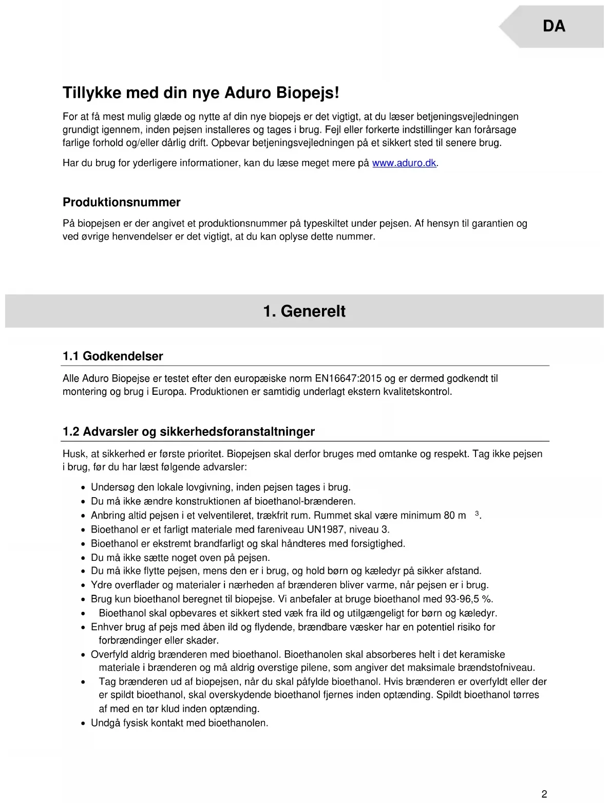 Tillykke med din nye Aduro Biopejs! For at få mest mulig glæde og nytte af din nye biopejs er det vigtigt, at du læser betjeningsvejledningen grundigt igennem, inden pejsen installeres og tages i brug. Fejl eller forkerte indstillinger kan forårsage farlige forhold og/eller dårlig drift. Opbevar betjeningsvejledningen på et sikkert sted til senere brug. Har du brug for yderligere informationer, kan du læse meget mere på www.aduro.dk. Produktionsnummer På biopejsen er der angivet et produktionsnummer på typeskiltet under pejsen. Af hensyn til garantien og ved øvrige henvendelser er det vigtigt, at du kan oplyse dette nummer.