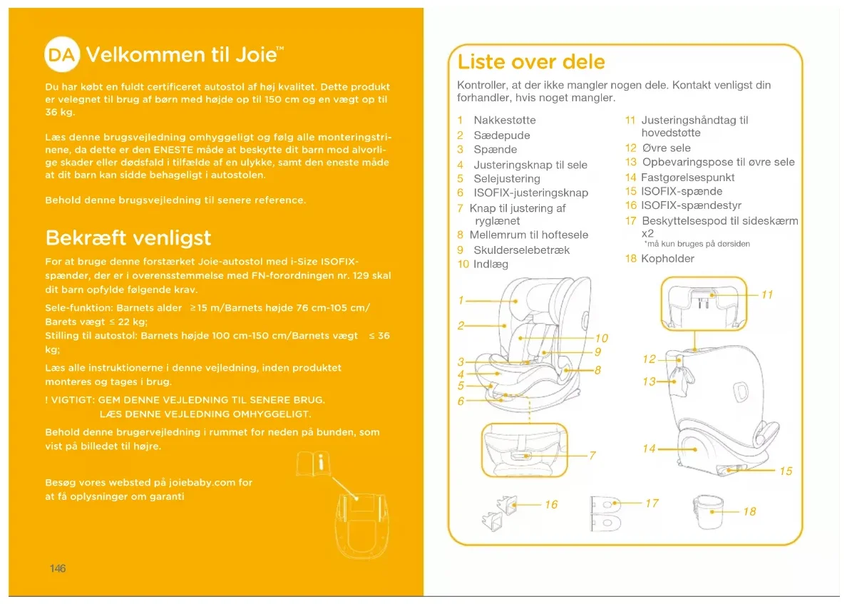 Du har købt en fuldt certificeret autostol af høj kvalitet. Dette produkt er velegnet til brug af børn med højde op til 150 cm og en vægt op til 36 kg.Læs denne brugsvejledning omhyggeligt og følg alle monteringstri-nene﹐ da dette er den ENESTE måde at beskytte dit barn mod alvorli-ge skader eller dødsfald i tilfælde af en ulykke﹐ samt den eneste måde at dit barn kan sidde behageligt i autostolen.Behold denne brugsvejledning til senere reference. Bekræft venligst For at bruge denne forstærket Joie-autostol med i-Size ISOFIX-spænder﹐ der er i overensstemmelse med FN-forordningen nr. 129 skal dit barn opfylde følgende krav.Sele-funktion: Barnets alder 15 m/Barnets højde 76 cm-105 cm/Barets vægt 22 kg;Stilling til autostol: Barnets højde 100 cm-150 cm/Barnets vægt