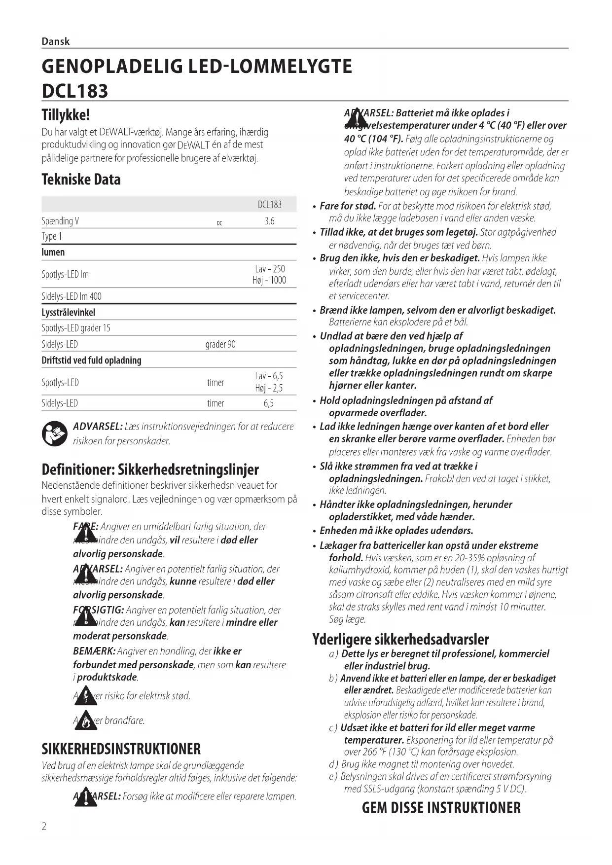 SIKKERHEDSINSTRUKTIONER Ved brug af en elektrisk lampe skal de grundlæggende sikkerhedsmæssige forholdsregler altid følges, inklusive det følgende: ADVARSEL: Forsøg ikke at modificere eller reparerelampen. ADVARSEL: Læs instruktionsvejledningen for at reducere risikoen forpersonskader. Definitioner: Sikkerhedsretningslinjer Nedenstående definitioner beskriver sikkerhedsniveauet for hvert enkelt signalord. Læs vejledningen og vær opmærksom på dissesymboler. FARE: Angiver en umiddelbart farlig situation, der medmindre den undgås, vil resultere i død eller alvorligpersonskade. ADVARSEL: Angiver en potentielt farlig situation, der medmindre den undgås, kunne resultere i død eller alvorligpersonskade. FORSIGTIG: Angiver en potentielt farlig situation, der medmindre den undgås, kan resultere i mindre eller moderatpersonskade. BEMÆRK: Angiver en handling, der ikke er forbundet med personskade, men som kan resultere iproduktskade. Angiver risiko for elektriskstød. Angiverbrandfare.DCL183Spænding V
