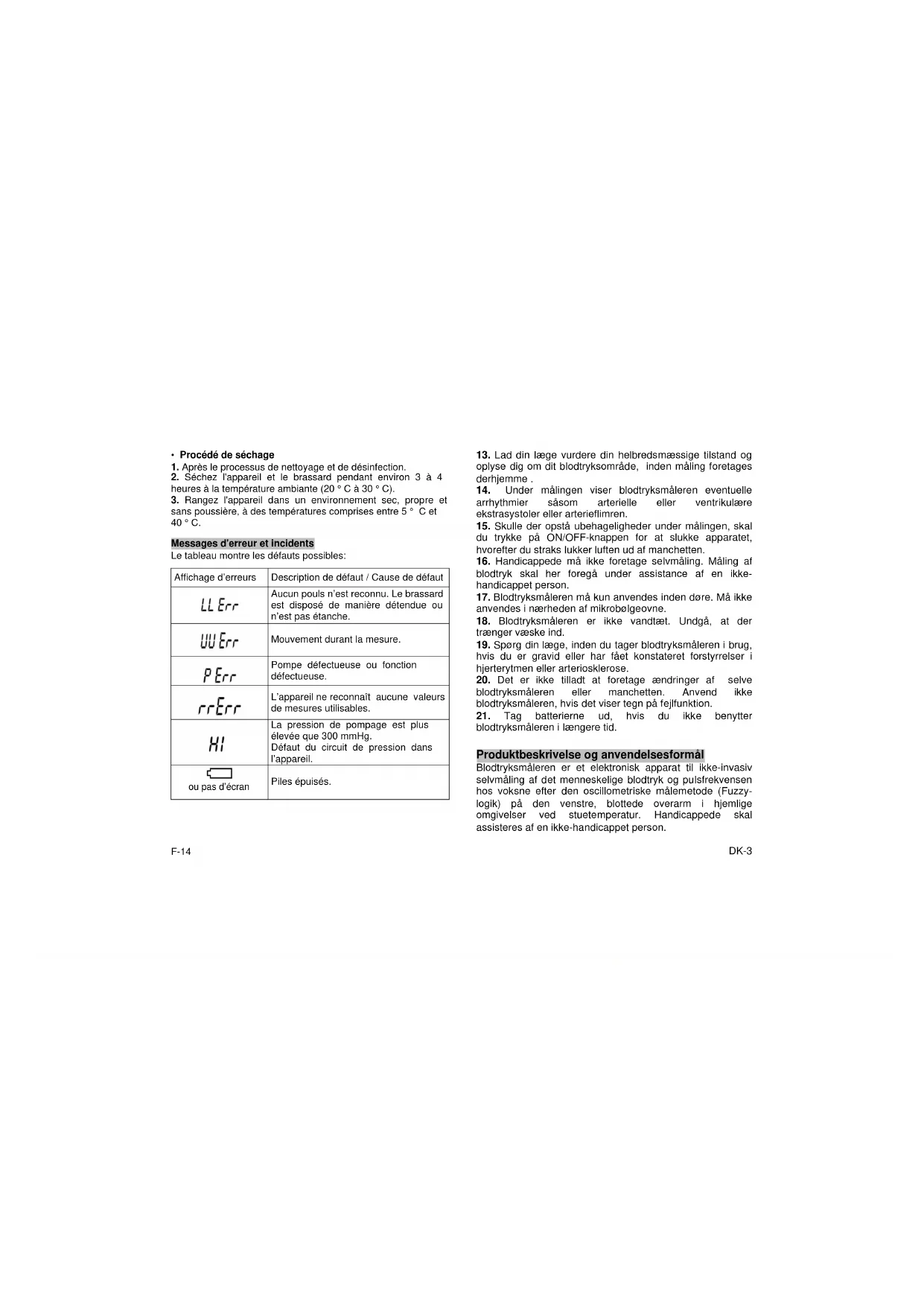 Produktbeskrivelse og anvendelsesformål Blodtryksmåleren er et elektronisk apparat til ikke-invasiv selvmåling af det menneskelige blodtryk og pulsfrekvensen hos voksne efter den oscillometriske målemetode (Fuzzy- logik) på den venstre, blottede overarm i hjemlige omgivelser ved stuetemperatur. Handicappede skal assisteres af en ikke-handicappet person. DK-3Forsigtighedsforanstaltninger ADVARSLER: