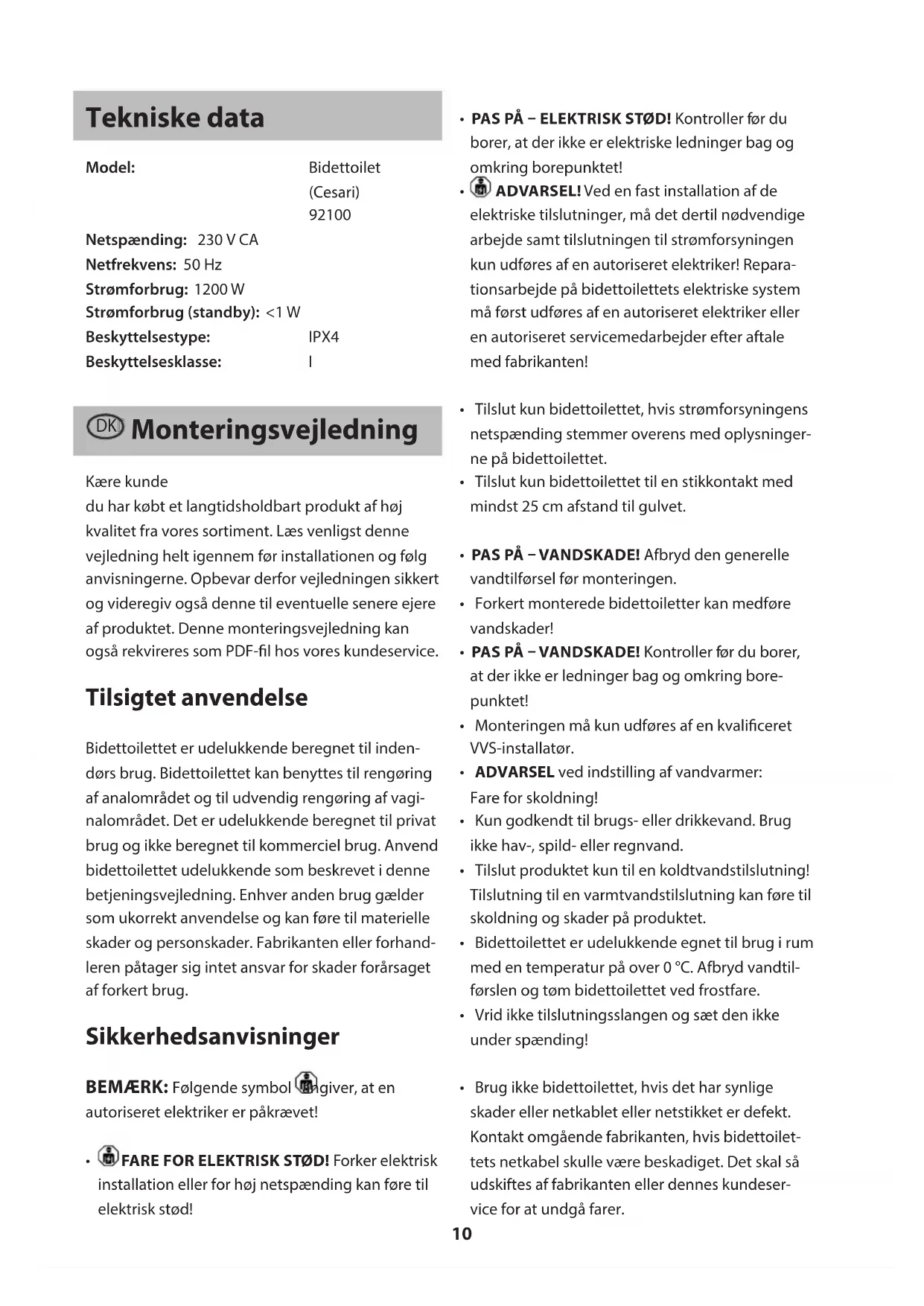 Netspænding: 230 V CA Netfrekvens: 50 Hz Strømforbrug: 1200 W Strømforbrug (standby): <1 W Beskyttelsestype: IPX4 Beskyttelsesklasse: I DKDK Monteringsvejledning Kære kunde du har købt et langtidsholdbart produkt af høj kvalitet fra vores sortiment. Læs venligst denne vejledning helt igennem før installationen og følg anvisningerne. Opbevar derfor vejledningen sikkert og videregiv også denne til eventuelle senere ejere af produktet. Denne monteringsvejledning kan også rekvireres som PDF-l hos vores kundeservice. Tilsigtet anvendelse Bidettoilettet er udelukkende beregnet til inden- dørs brug. Bidettoilettet kan benyttes til rengøring af analområdet og til udvendig rengøring af vagi- nalområdet. Det er udelukkende beregnet til privat brug og ikke beregnet til kommerciel brug. Anvend bidettoilettet udelukkende som beskrevet i denne betjeningsvejledning. Enhver anden brug gælder som ukorrekt anvendelse og kan føre til materielle skader og personskader. Fabrikanten eller forhand- leren påtager sig intet ansvar for skader forårsaget af forkert brug. Sikkerhedsanvisninger BEMÆRK: Følgende symbol angiver, at en autoriseret elektriker er påkrævet!