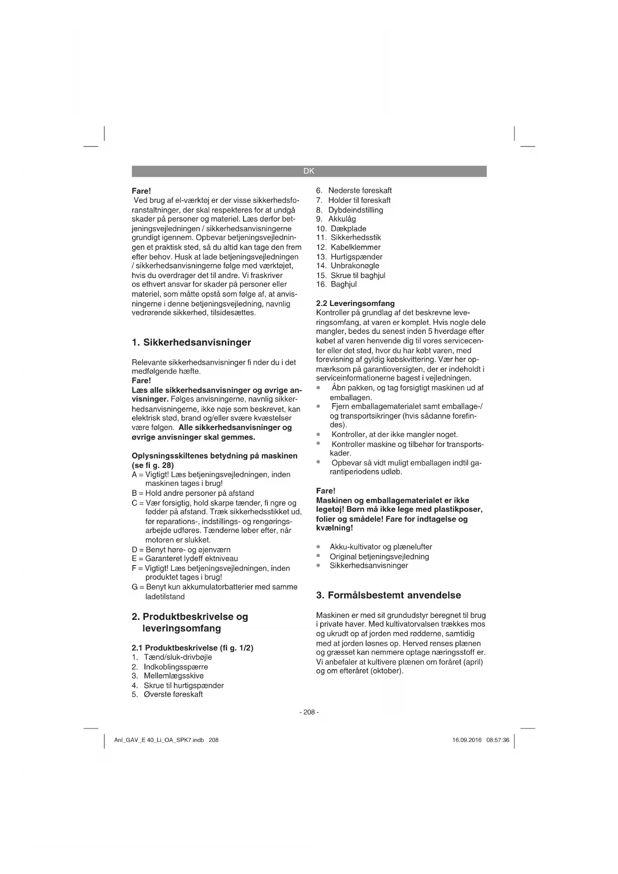 Maskinen er med sit grundudstyr beregnet til brug i private haver. Med kultivatorvalsen trækkes mos og ukrudt op af jorden med rødderne, samtidig med at jorden løsnes op. Herved renses plænen og græsset kan nemmere optage næringsstoff er. Vi anbefaler at kultivere plænen om foråret (april) og om efteråret (oktober). Anl_GAV_E 40_Li_OA_SPK7.indb 208Anl_GAV_E 40_Li_OA_SPK7.indb 208 16.09.2016 08:57:3616.09.2016 08:57:36DK