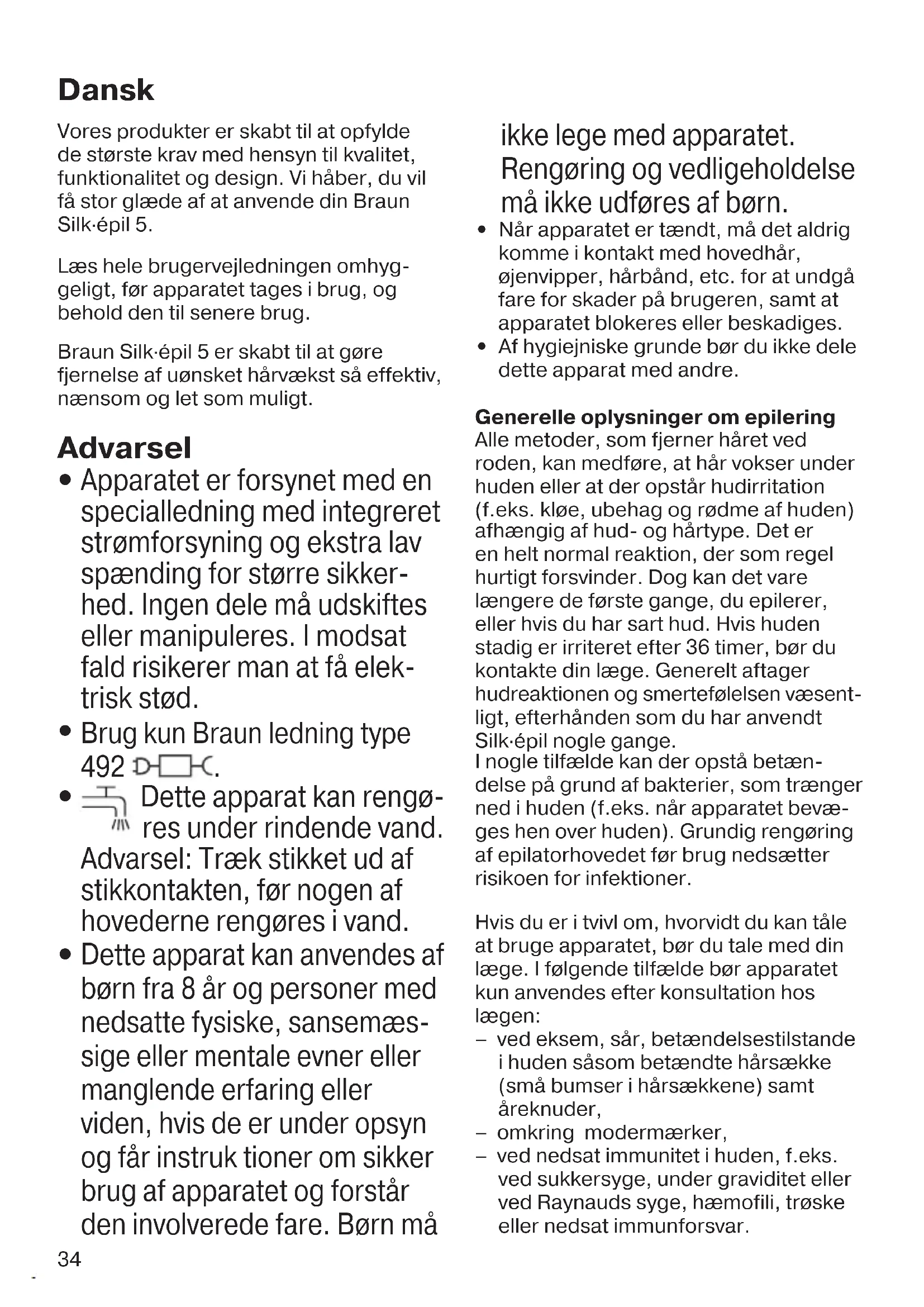 - Hvis du er vant til følelsen af epilering, kan du bruge toppen til hudkontakt (1b) som giver nærmere kontakt med huden. 3 Epilering af benene Epiler dine ben fra underbenet i opadgående retning. Ved epilering bag knæet holdes benet strakt. 4 Epilering under armene og i bikinilinjen Vær opmærksom på, at områderne især i begyndelsen er meget følsomme over for smerte. Derfor anbefaler vi, at 90340813_SE5_Power_MN.indd 3590340813_SE5_Power_MN.indd 35 02.06.22 10:4902.06.22 10:4936 du begynder med at vælge indstilling «I». Ved gentagen brug aftager følelsen af smerte. Før epilering skal området rengøres grundigt for at fjerne rester af for eksempel deodorant. Dup dig derefter forsigtigt tør med et håndklæde. Når du epilerer under armen, skal armen holdes løftet, så huden er strakt ud. Bevæg apparatet i forskellige retninger. Da huden kan være mere følsom lige efter epilering, bør du undgå at bruge irriterende midler som deodoranter med alkohol. 5 Rengøring af epilatorhovedet Inden rengøring trækkes stikket ud af stikkontakten. Regelmæssig rengøring sikrer en bedre epilering. a Rengøring med børste: Fjern hætten og børst den af. Rengør pincetterne grundigt fra bagsiden af epilatorhovedet med en børste dyppet i rensevæske. Drej pincetelementet manuelt imens. Denne rengøring sikrer den bedste hygiejne for epilatorhove- det. b Rengøring under rindende vand: Fjern hætten. Hold apparatet med epilatorhovedet under rindende vand. Tryk så på udløserknappen (5) for at fjerne epilatorhovedet (2). Ryst både epilatorhovedet og apparatet grundigt for at sikre, at det sidste vand kommer ud. Lad begge dele tørre. Sørg for, at de er helt tørre, inden de samles igen. B Hvordan man bruger barberhovedet Barberhovedet (7) er designet til en hurtig barbeing af ben, under armene, bikinilinjen og konturtrimning og klipning af hår ned til 5 mm i længden. Med barberhovedet skal apparatet kun bruges på tør hud, og på hastighed «II». a Barbering: vælg « ». b Konturtrimning: vælg « ». c Trim hår til 5 mm: vælg « ». Monter trimmertoppen (a). d Rengøring: Rengør ikke skærebladet (b) med en børste da det kan ødelægge det. e De skærende dele skal smøres regelmæssigt hver 3 måned. f Erstat rammen til skærebladet (II) og skæreblok (III) når du mærker en reduceret ydelse. Reservedele kan købes hos din forhandler eller Braun. Miljømæssige oplysninger Dette produkt indeholder batterier og genanvendeligt elektronik- affald. For at beskytte miljøet, ikke borts kaffe det i husholdnings- affaldet, men tage det til passende lokale indsamlingssteder. Oplysningerne heri kan ændres uden varsel. Garanti Braun yder 2 års garanti på dette produkt gældende fra købsdatoen. Inden for garantiperioden vil Braun for egen regning afhjælpe fabrikations- og materialefejl efter vort skøn gennem reparation eller ombytning af apparatet. Denne garanti gælder i alle lande, hvor Braun er repræsenteret. Denne garanti dækker ikke skader opstået ved fejlbetjening, normalt slid eller fejl som har ringe effekt på værdien eller funktionsdygtigheden af apparatet. Garantien bortfalder ved reparationer udført af andre end de af Braun anviste reparatører og hvor originale Braun reservedele ikke er anvendt. Ved service inden for garantiperioden afleveres eller indsendes hele apparatet 90340813_SE5_Power_MN.indd 3690340813_SE5_Power_MN.indd 36 02.06.22 10:4902.06.22 10:4937 sammen med købsbevis til et autoriseret Braun Service Center: www.service.braun.com. Ring 7015 0013 for oplysning om nærmeste Braun Service Center. 90340813_SE5_Power_MN.indd 3790340813_SE5_Power_MN.indd 37 02.06.22 10:4902.06.22 10:4938 Våre produkter er konstruert for å imøte- komme de høyeste standarder når det gjelder kvalitet, funksjonalitet og design. Vi håper du blir fornøyd med din nye Braun Silk·épil 5. Les bruksanvisningen nøye og fullstendig før du begynner å bruke apparatet, og ta vare på den til senere bruk. Braun Silk·épil 5 er utviklet for å gjøre fjerning av uønsket hår så effektivt, skån- somt og enkelt som mulig. Advarsel