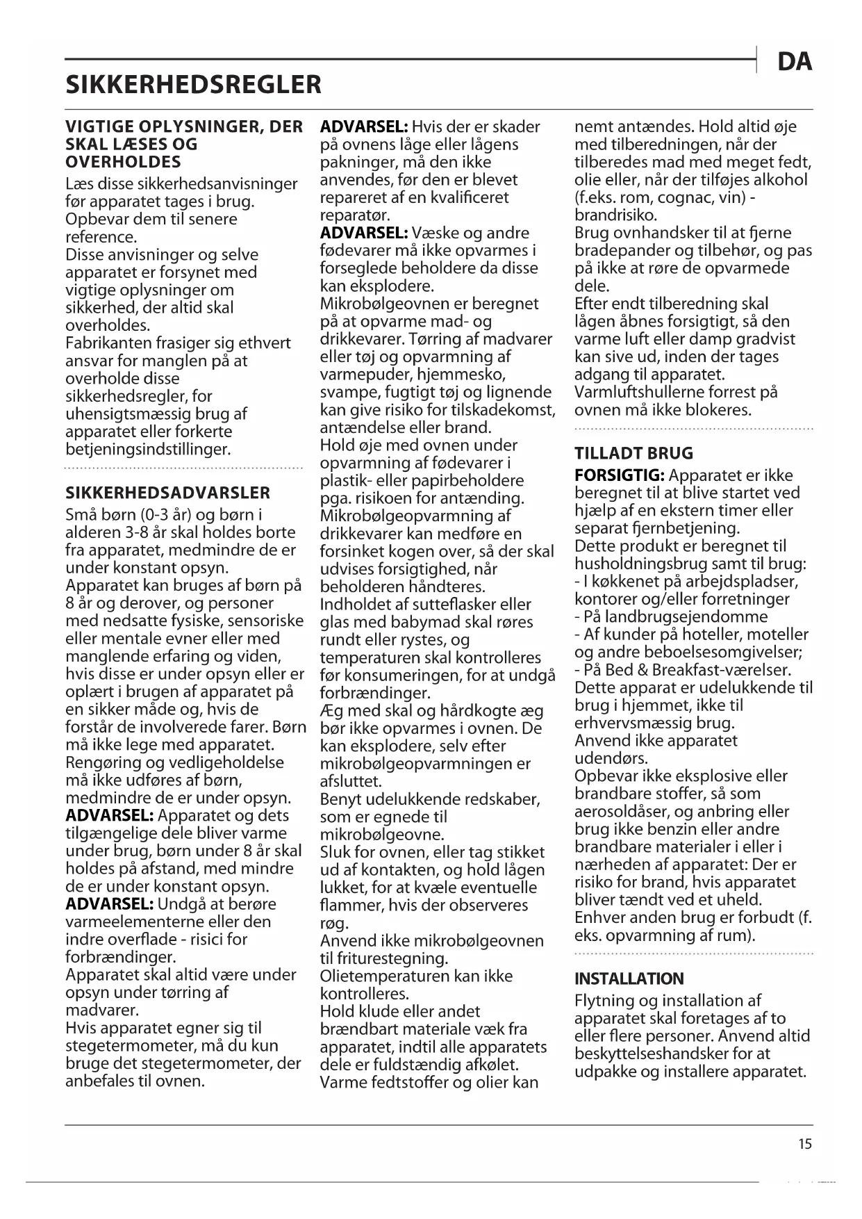 OVERHOLDES Læs disse sikkerhedsanvisninger før apparatet tages i brug. Opbevar dem til senere reference. Disse anvisninger og selve apparatet er forsynet med vigtige oplysninger om sikkerhed, der altid skal overholdes. Fabrikanten frasiger sig ethvert ansvar for manglen på at overholde disse sikkerhedsregler, for uhensigtsmæssig brug af apparatet eller forkerte betjeningsindstillinger. SIKKERHEDSADVARSLER Små børn (0-3 år) og børn i alderen 3-8 år skal holdes borte fra apparatet, medmindre de er under konstant opsyn. Apparatet kan bruges af børn på 8 år og derover, og personer med nedsatte fysiske, sensoriske eller mentale evner eller med manglende erfaring og viden, hvis disse er under opsyn eller er oplært i brugen af apparatet på en sikker måde og, hvis de forstår de involverede farer. Børn må ikke lege med apparatet. Rengøring og vedligeholdelse må ikke udføres af børn, medmindre de er under opsyn. ADVARSEL: Apparatet og dets tilgængelige dele bliver varme under brug, børn under 8 år skal holdes på afstand, med mindre de er under konstant opsyn. ADVARSEL: Undgå at berøre varmeelementerne eller den indre overflade - risici for forbrændinger. Apparatet skal altid være under opsyn under tørring af madvarer. Hvis apparatet egner sig til stegetermometer, må du kun bruge det stegetermometer, der anbefales til ovnen. ADVARSEL: Hvis der er skader på ovnens låge eller lågens pakninger, må den ikke anvendes, før den er blevet repareret af en kvalificeret reparatør. ADVARSEL: Væske og andre fødevarer må ikke opvarmes i forseglede beholdere da disse kan eksplodere. Mikrobølgeovnen er beregnet på at opvarme mad- og drikkevarer. Tørring af madvarer eller tøj og opvarmning af varmepuder, hjemmesko, svampe, fugtigt tøj og lignende kan give risiko for tilskadekomst, antændelse eller brand. Hold øje med ovnen under opvarmning af fødevarer i plastik- eller papirbeholdere pga. risikoen for antænding. Mikrobølgeopvarmning af drikkevarer kan medføre en forsinket kogen over, så der skal udvises forsigtighed, når beholderen håndteres. Indholdet af sutteflasker eller glas med babymad skal røres rundt eller rystes, og temperaturen skal kontrolleres før konsumeringen, for at undgå forbrændinger. Æg med skal og hårdkogte æg bør ikke opvarmes i ovnen. De kan eksplodere, selv efter mikrobølgeopvarmningen er afsluttet. Benyt udelukkende redskaber, som er egnede til mikrobølgeovne. Sluk for ovnen, eller tag stikket ud af kontakten, og hold lågen lukket, for at kvæle eventuelle flammer, hvis der observeres røg. Anvend ikke mikrobølgeovnen til friturestegning. Olietemperaturen kan ikke kontrolleres. Hold klude eller andet brændbart materiale væk fra apparatet, indtil alle apparatets dele er fuldstændig afkølet. Varme fedtstoffer og olier kan nemt antændes. Hold altid øje med tilberedningen, når der tilberedes mad med meget fedt, olie eller, når der tilføjes alkohol (f.eks. rom, cognac, vin) - brandrisiko. Brug ovnhandsker til at erne bradepander og tilbehør, og pas på ikke at røre de opvarmede dele. Efter endt tilberedning skal lågen åbnes forsigtigt, så den varme luft eller damp gradvist kan sive ud, inden der tages adgang til apparatet. Varmluftshullerne forrest på ovnen må ikke blokeres. TILLADT BRUG FORSIGTIG: Apparatet er ikke beregnet til at blive startet ved hjælp af en ekstern timer eller separat ernbetjening. Dette produkt er beregnet til husholdningsbrug samt til brug: - I køkkenet på arbejdspladser, kontorer og/eller forretninger - På landbrugsejendomme - Af kunder på hoteller, moteller og andre beboelsesomgivelser; - På Bed & Breakfast-værelser. Dette apparat er udelukkende til brug i hjemmet, ikke til erhvervsmæssig brug. Anvend ikke apparatet udendørs. Opbevar ikke eksplosive eller brandbare stoffer, så som aerosoldåser, og anbring eller brug ikke benzin eller andre brandbare materialer i eller i nærheden af apparatet: Der er risiko for brand, hvis apparatet bliver tændt ved et uheld. Enhver anden brug er forbudt (f. eks. opvarmning af rum). INSTALLATION Flytning og installation af apparatet skal foretages af to eller flere personer. Anvend altid beskyttelseshandsker for at udpakke og installere apparatet.16 Dette apparat er beregnet til indbygning. Anvend det aldrig fritstående. Installationen eller vedligeholdelsen skal udføres af en autoriseret elinstallatør i henhold til producentens anvisninger og gældende lovgivning. Reparér eller udskift ingen af apparatets dele, medmindre dette specifikt er anført i brugsvejledningen. Børn må ikke udføre installationshandlingerne. Børn skal derfor holdes væk under installationen. Hold emballagen (plastikposer, dele af polystyren, etc.) udenfor børns rækkevidde under og efter installationen. Kontrollér, at apparatet ikke er blevet beskadiget under transporten. Kontakt forhandleren eller serviceafdelingen, hvis der er problemer. Tag stikket ud af stikkontakten før, der udføres enhver form for installationsindgreb. Under opstillingen kontrolleres det, at apparatet ikke beskadiger elkablet. Aktiver kun apparatet, når installationen er fuldendt. Der må ikke være adgang til apparatets nederste del efter installationen. Skær køkkenelementet til, så det passer, før apparatet installeres i skabet, og ern omhyggeligt eventuel savsmuld og træspåner. Bloker ikke mellemrummet mellem køkkenbordet og ovnens øvre kant. Fjern kun polystyrenskumunderlaget i forbindelse med selve installationen. Installér ikke apparatet bag en pyntelåge - Brandfare. Når emballagen er ernet, skal det kontrolleres, at lågen lukker korrekt. Kontakt forhandleren eller serviceafdelingen, hvis der er problemer. ELEKTRISKE ADVARSLER For at opfylde de gældende sikkerhedsdirektiver for installation skal der anvendes en flerpolet kontakt med en afstand på mindst 3 mm, og apparatet skal være jordforbundet. Udskift et beskadiget strømkabel med et tilsvarende kabel. Elkablet ska