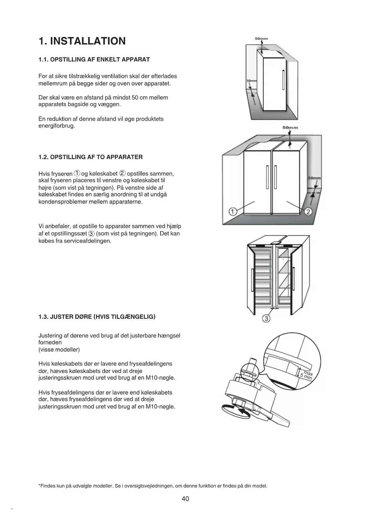 opstillessammen, skalfryserenplacerestilvenstreogkøleskabettil højre(somvistpåtegningen).Påvenstresideaf køleskabetfindesensærliganordningtilatundgå kondensproblemermellemapparaterne. Vianbefaler,atopstilletoapparatersammenvedhjælp afetopstillingssæt