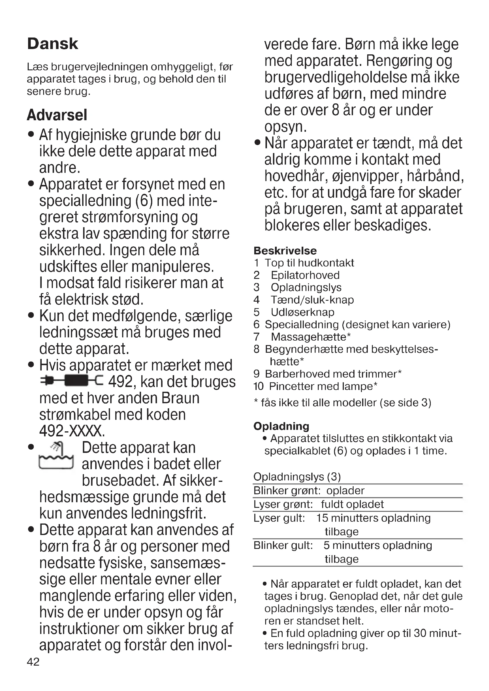 Når apparatet er tændt, må det aldrig komme i kontakt med hovedhår, øjenvipper, hårbånd, etc. for at undgå fare for skader på brugeren, samt at apparatet blokeres eller beskadiges. Beskrivelse 1 Top til hudkontakt 2 Epilatorhoved 3 Opladningslys 4 Tænd/sluk-knap 5 Udløserknap 6 Specialledning (designet kan variere) 7 Massagehætte* 8 Begynderhætte med beskyttelses- hætte* 9 Barberhoved med trimmer* 0 Pincetter med lampe*