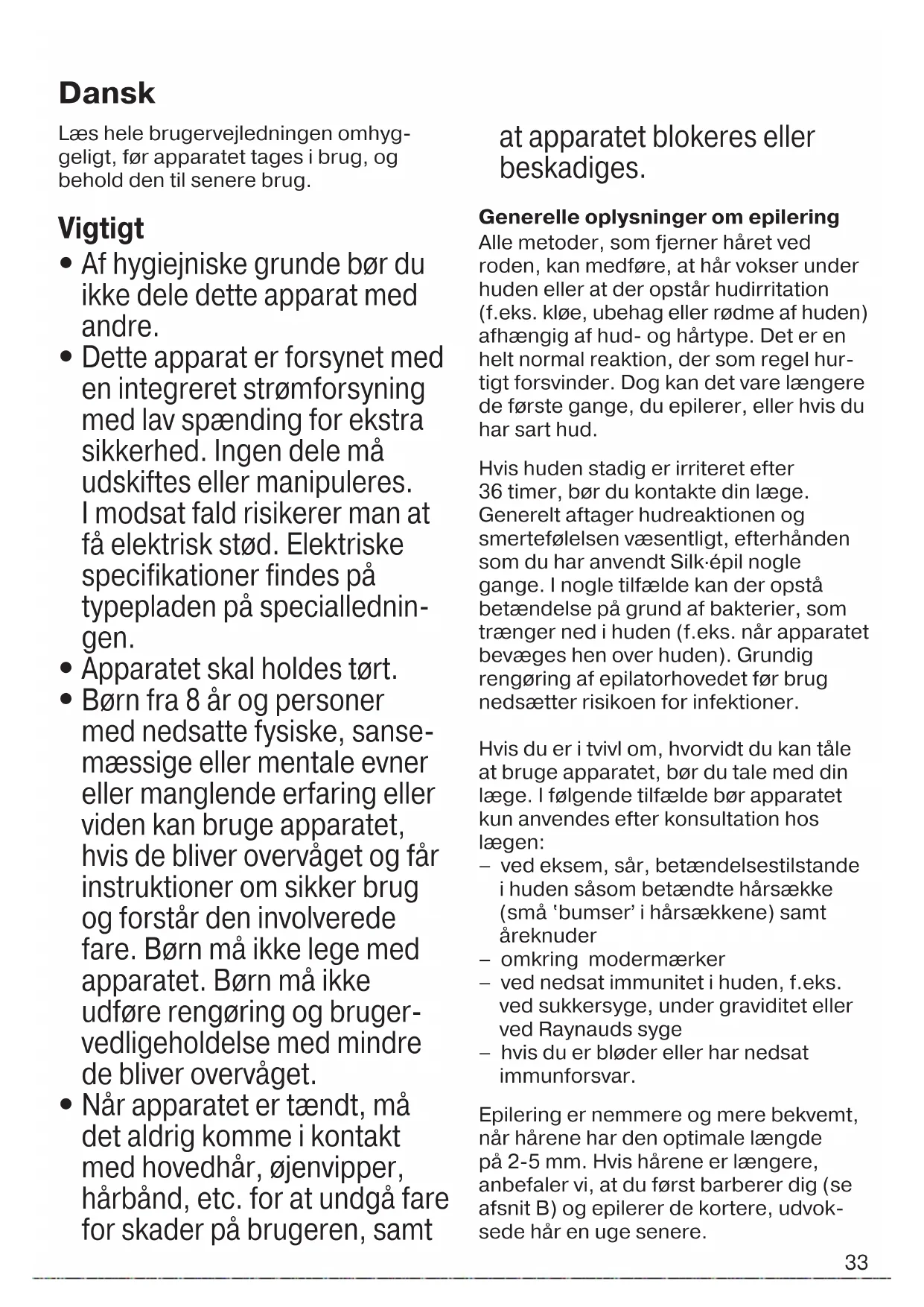 Når apparatet er tændt, må det aldrig komme i kontakt med hovedhår, øjenvipper, hårbånd, etc. for at undgå fare for skader på brugeren, samt at apparatet blokeres eller beskadiges. Generelle oplysninger om epilering Alle metoder, som fjerner håret ved roden, kan medføre, at hår vokser under huden eller at der opstår hudirritation (f.eks. kløe, ubehag eller rødme af huden) afhængig af hud- og hårtype. Det er en helt normal reaktion, der som regel hur- tigt forsvinder. Dog kan det vare længere de første gange, du epilerer, eller hvis du har sart hud. Hvis huden stadig er irriteret efter 36 timer, bør du kontakte din læge. Generelt aftager hudreaktionen og smertefølelsen væsentligt, efterhånden som du har anvendt Silk·épil nogle gange. I nogle tilfælde kan der opstå betændelse på grund af bakterier, som trænger ned i huden (f.eks. når apparatet bevæges hen over huden). Grundig rengøring af epilatorhovedet før brug nedsætter risikoen for infektioner. Hvis du er i tvivl om, hvorvidt du kan tåle at bruge apparatet, bør du tale med din læge. I følgende tilfælde bør apparatet kun anvendes efter konsultation hos lægen: – ved eksem, sår, betændelsestilstande i huden såsom betændte hårsække (små ʽbumserʼ i hårsækkene) samt åreknuder – omkring modermærker – ved nedsat immunitet i huden, f.eks. ved sukkersyge, under graviditet eller ved Raynauds syge – hvis du er bløder eller har nedsat immunforsvar. Epilering er nemmere og mere bekvemt, når hårene har den optimale længde på 2-5 mm. Hvis hårene er længere, anbefaler vi, at du først barberer dig (se afsnit B) og epilerer de kortere, udvok- sede hår en uge senere. Dansk 91618385_SE_3273_3274_GROCERY_S6-60.indd 3391618385_SE_3273_3274_GROCERY_S6-60.indd 33 22.08.17 08:3022.08.17 08:30 CSS APPROVED Effective Date 25Aug2017 GMT - Printed 22Nov2017 Page 33 of 6034 Nyudvoksede, fine hår kan have svært ved at bryde igennem hudoverfladen. Regelmæssig brug af massagesvamp (f.eks. efter badet) eller eksfolierende peelingcreme er med til at forhindre, at hår gror indad, da de blide skrubbebe- vægelser fjerner det øverste hudlag, så de fine hår kan bryde igennem hudover- fladen. Beskrivelse 1 Massagerulletilbehør 2 Epilatorhoved med pincetelement 3 Udløserknapper 4 Tænd/sluk-knap med lys 5 Stik 6 Specialledning 7 Barberhovedtilbehør med trimmer- hætte A Sådan epilerer du