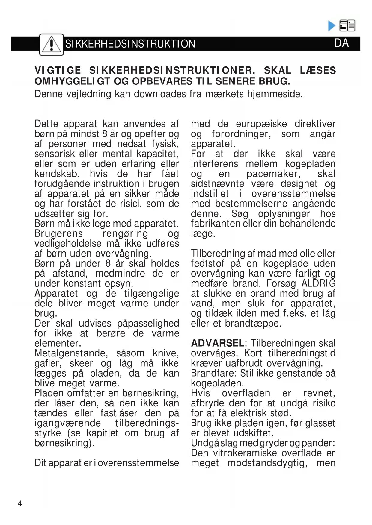 DA4 Dette apparat kan anvendes af børn på mindst 8 år og opefter og af personer med nedsat fysisk, sensorisk eller mental kapacitet, eller som er uden erfaring eller kendskab, hvis de har fået forudgående instruktion i brugen af apparatet på en sikker måde og har forstået de risici, som de udsætter sig for. Børn må ikke lege med apparatet. Brugerens rengøring og vedligeholdelse må ikke udføres af børn uden overvågning. Børn på under 8 år skal holdes på afstand, medmindre de er under konstant opsyn. Apparatet og de tilgængelige dele bliver meget varme under brug. Der skal udvises påpasselighed for ikke at berøre de varme elementer. Metalgenstande, såsom knive, gafler, skeer og låg må ikke lægges på pladen, da de kan blive meget varme. Pladen omfatter en børnesikring, der låser den, så den ikke kan tændes eller fastlåser den på igangværende tilberednings- styrke (se kapitlet om brug af børnesikring). Dit apparat er i overensstemmelse med de europæiske direktiver og forordninger, som angår apparatet. For at der ikke skal være interferens mellem kogepladen og en pacemaker, skal sidstnævnte være designet og indstillet i overensstemmelse med bestemmelserne angående denne. Søg oplysninger hos fabrikanten eller din behandlende læge. Tilberedning af mad med olie eller fedtstof på en kogeplade uden overvågning kan være farligt og medføre brand. Forsøg ALDRIG at slukke en brand med brug af vand, men sluk for apparatet, og tildæk ilden med f.eks. et låg eller et brandtæppe. ADVARSEL: Tilberedningen skal overvåges. Kort tilberedningstid kræver uafbrudt overvågning. Brandfare: Stil ikke genstande på kogepladen. Hvis overfladen er revnet, afbryde den for at undgå risiko for at få elektrisk stød. Brug ikke pladen igen, før glasset er blevet udskiftet. Undgå slag med gryder og pander: Den vitrokeramiske overflade er meget modstandsdygtig, men
