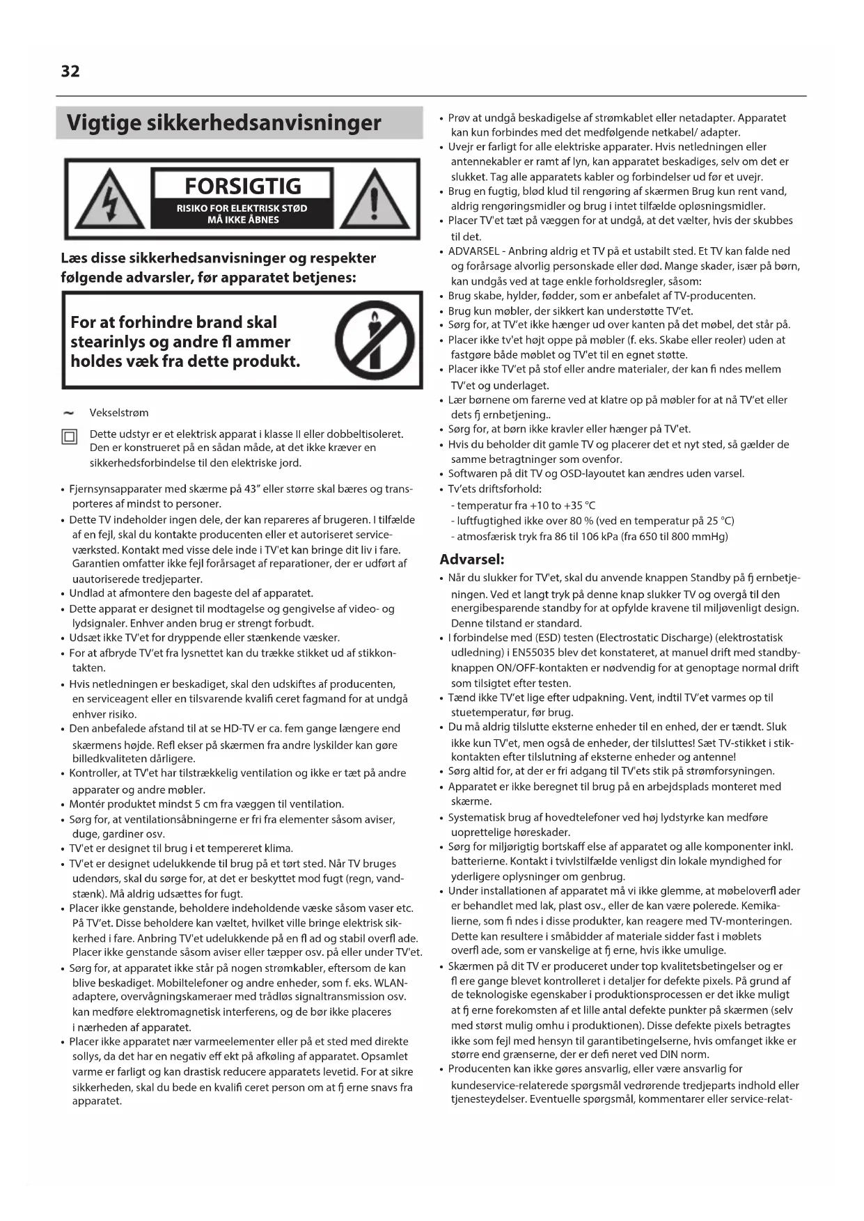 - Dette TV indeholder ingen dele, der kan repareres af brugeren. Itilfælde af en fejl, skal du kontakte producenten eller et autoriseret service- værksted. Kontakt med visse dele inde iTV'et kan bringe dit liv ifare. Garantien omfatter ikke fejl forårsaget af reparationer, der er udført af uautoriserede tredjeparter.