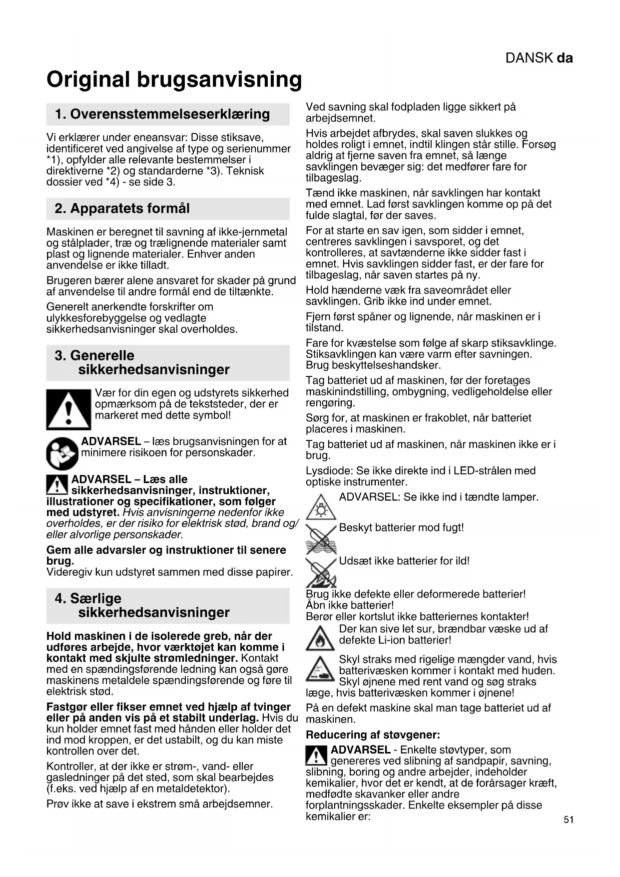 Original brugsanvisning Vi erklærer under eneansvar: Disse stiksave, identificeret ved angivelse af type og serienummer *1), opfylder alle relevante bestemmelser i direktiverne *2) og standarderne *3). Teknisk dossier ved *4) - se side 3. Maskinen er beregnet til savning af ikke-jernmetal og stålplader, træ og trælignende materialer samt plast og lignende materialer. Enhver anden anvendelse er ikke tilladt. Brugeren bærer alene ansvaret for skader på grund af anvendelse til andre formål end de tiltænkte. Generelt anerkendte forskrifter om ulykkesforebyggelse og vedlagte sikkerhedsanvisninger skal overholdes. Vær for din egen og udstyrets sikkerhed opmærksom på de tekststeder, der er markeret med dette symbol! ADVARSEL – læs brugsanvisningen for at minimere risikoen for personskader. ADVARSEL – Læs alle sikkerhedsanvisninger, instruktioner, illustrationer og specifikationer, som følger med udstyret. Hvis anvisningerne nedenfor ikke overholdes, er der risiko for elektrisk stød, brand og/ eller alvorlige personskader. Gem alle advarsler og instruktioner til senere brug. Videregiv kun udstyret sammen med disse papirer. Hold maskinen i de isolerede greb, når der udføres arbejde, hvor værktøjet kan komme i kontakt med skjulte strømledninger. Kontakt med en spændingsførende ledning kan også gøre maskinens metaldele spændingsførende og føre til elektrisk stød. Fastgør eller fikser emnet ved hjælp af tvinger eller på anden vis på et stabilt underlag. Hvis du kun holder emnet fast med hånden eller holder det ind mod kroppen, er det ustabilt, og du kan miste kontrollen over det. Kontroller, at der ikke er strøm-, vand- eller gasledninger på det sted, som skal bearbejdes (f.eks. ved hjælp af en metaldetektor). Prøv ikke at save i ekstrem små arbejdsemner. Ved savning skal fodpladen ligge sikkert på arbejdsemnet. Hvis arbejdet afbrydes, skal saven slukkes og holdes roligt i emnet, indtil klingen står stille. Forsøg aldrig at fjerne saven fra emnet, så længe savklingen bevæger sig: det medfører fare for tilbageslag. Tænd ikke maskinen, når savklingen har kontakt med emnet. Lad først savklingen komme op på det fulde slagtal, før der saves. For at starte en sav igen, som sidder i emnet, centreres savklingen i savsporet, og det kontrolleres, at savtænderne ikke sidder fast i emnet. Hvis savklingen sidder fast, er der fare for tilbageslag, når saven startes på ny. Hold hænderne væk fra saveområdet eller savklingen. Grib ikke ind under emnet. Fjern først spåner og lignende, når maskinen er i tilstand. Fare for kvæstelse som følge af skarp stiksavklinge. Stiksavklingen kan være varm efter savningen. Brug beskyttelseshandsker. Tag batteriet ud af maskinen, før der foretages maskinindstilling, ombygning, vedligeholdelse eller rengøring. Sørg for, at maskinen er frakoblet, når batteriet placeres i maskinen. Tag batteriet ud af maskinen, når maskinen ikke er i brug. Lysdiode: Se ikke direkte ind i LED-strålen med optiske instrumenter. ADVARSEL: Se ikke ind i tændte lamper. Beskyt batterier mod fugt! Udsæt ikke batterier for ild! Brug ikke defekte eller deformerede batterier! Åbn ikke batterier! Berør eller kortslut ikke batteriernes kontakter! Der kan sive let sur, brændbar væske ud af defekte Li-ion batterier! Skyl straks med rigelige mængder vand, hvis batterivæsken kommer i kontakt med huden. Skyl øjnene med rent vand og søg straks læge, hvis batterivæsken kommer i øjnene! På en defekt maskine skal man tage batteriet ud af maskinen. Reducering af støvgener: ADVARSEL - Enkelte støvtyper, som genereres ved slibning af sandpapir, savning, slibning, boring og andre arbejder, indeholder kemikalier, hvor det er kendt, at de forårsager kræft, medfødte skavanker eller andre forplantningsskader. Enkelte eksempler på disse kemikalier er: