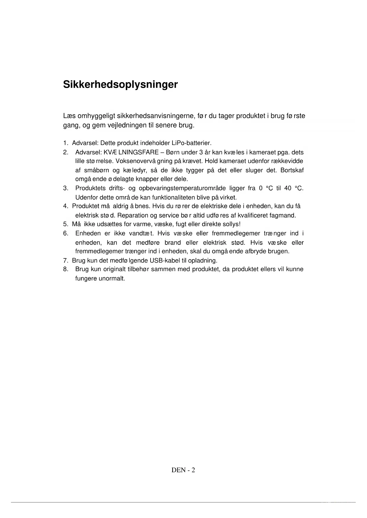 8. Brug kun originalt tilbehør sammen med produktet, da produktet ellers vil kunne