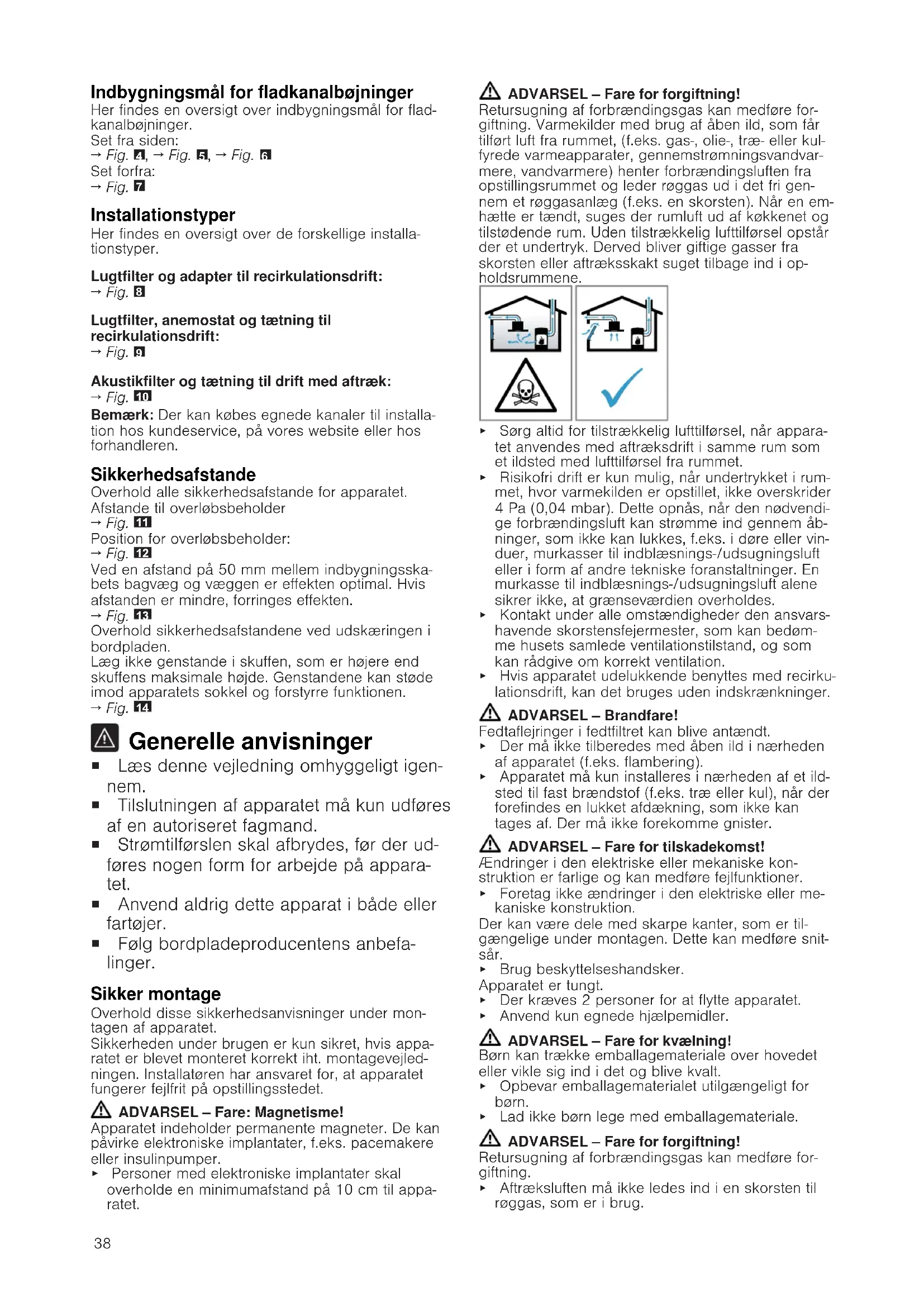 Generelle anvisninger ¡ Læs denne vejledning omhyggeligt igen- nem. ¡ Tilslutningen af apparatet må kun udføres af en autoriseret fagmand. ¡ Strømtilførslen skal afbrydes, før der ud- føres nogen form for arbejde på appara- tet. ¡ Anvend aldrig dette apparat i både eller fartøjer. ¡ Følg bordpladeproducentens anbefa- linger. Sikker montage Overhold disse sikkerhedsanvisninger under mon- tagen af apparatet. Sikkerheden under brugen er kun sikret, hvis appa- ratet er blevet monteret korrekt iht. montagevejled- ningen. Installatøren har ansvaret for, at apparatet fungerer fejlfrit på opstillingsstedet. ADVARSEL‒Fare: Magnetisme! Apparatet indeholder permanente magneter. De kan påvirke elektroniske implantater, f.eks. pacemakere eller insulinpumper. ▶ Personer med elektroniske implantater skal overholde en minimumafstand på 10cm til appa- ratet. ADVARSEL‒Fare for forgiftning! Retursugning af forbrændingsgas kan medføre for- giftning. Varmekilder med brug af åben ild, som får tilført luft fra rummet, (f.eks. gas-, olie-, træ- eller kul- fyrede varmeapparater, gennemstrømningsvandvar- mere, vandvarmere) henter forbrændingsluften fra opstillingsrummet og leder røggas ud i det fri gen- nem et røggasanlæg (f.eks. en skorsten). Når en em- hætte er tændt, suges der rumluft ud af køkkenet og tilstødende rum. Uden tilstrækkelig lufttilførsel opstår der et undertryk. Derved bliver giftige gasser fra skorsten eller aftræksskakt suget tilbage ind i op- holdsrummene. ▶ Sørg altid for tilstrækkelig lufttilførsel, når appara- tet anvendes med aftræksdrift i samme rum som et ildsted med lufttilførsel fra rummet. ▶ Risikofri drift er kun mulig, når undertrykket i rum- met, hvor varmekilden er opstillet, ikke overskrider 4Pa(0,04mbar). Dette opnås, når den nødvendi- ge forbrændingsluft kan strømme ind gennem åb- ninger, som ikke kan lukkes, f.eks. i døre eller vin- duer, murkasser til indblæsnings-/udsugningsluft eller i form af andre tekniske foranstaltninger. En murkasse til indblæsnings-/udsugningsluft alene sikrer ikke, at grænseværdien overholdes. ▶ Kontakt under alle omstændigheder den ansvars- havende skorstensfejermester, som kan bedøm- me husets samlede ventilationstilstand, og som kan rådgive om korrekt ventilation. ▶ Hvis apparatet udelukkende benyttes med recirku- lationsdrift, kan det bruges uden indskrænkninger. ADVARSEL‒Brandfare! Fedtaflejringer i fedtfiltret kan blive antændt. ▶ Der må ikke tilberedes med åben ild i nærheden af apparatet (f.eks. flambering). ▶ Apparatet må kun installeres i nærheden af et ild- sted til fast brændstof (f.eks. træ eller kul), når der forefindes en lukket afdækning, som ikke kan tages af. Der må ikke forekomme gnister. ADVARSEL‒Fare for tilskadekomst! Ændringer i den elektriske eller mekaniske kon- struktion er farlige og kan medføre fejlfunktioner. ▶ Foretag ikke ændringer i den elektriske eller me- kaniske konstruktion. Der kan være dele med skarpe kanter, som er til- gængelige under montagen. Dette kan medføre snit- sår. ▶ Brug beskyttelseshandsker. Apparatet er tungt. ▶ Der kræves 2 personer for at flytte apparatet. ▶ Anvend kun egnede hjælpemidler. ADVARSEL‒Fare for kvælning! Børn kan trække emballagemateriale over hovedet eller vikle sig ind i det og blive kvalt. ▶ Opbevar emballagematerialet utilgængeligt for børn. ▶ Lad ikke børn lege med emballagemateriale. ADVARSEL‒Fare for forgiftning! Retursugning af forbrændingsgas kan medføre for- giftning. ▶ Aftræksluften må ikke ledes ind i en skorsten til røggas, som er i brug.39 ▶ Aftræksluften må ikke ledes ind i en skakt, som bruges til ventilation af rum, hvor der er opstillet ovne, kaminer eller andre former for ildsteder. ▶ Hvis aftræksluften skal ledes ind i en skorsten til røggas, som ikke er i brug, skal installationen god- kendes af den ansvarshavende skorstensfejerme- ster. Retursugning af forbrændingsgas kan medføre for- giftning. ▶ Når en emhætte installeres med et rumluftafhæn- gigt brændselsfyret komfur eller ildsted, skal em- hættens strømtilførsel være udstyret med en egnet sikkerhedsafbryder. Oplysninger om elektrisk tilslutning For at kunne foretage en sikker elektrisk tilslutning af apparatet skal disse anvisninger overholdes. ADVARSEL‒Fare for elektrisk stød! Det skal altid være muligt at afbryde strømforsynin- gen til apparatet. Dette apparat må kun tilsluttes en korrekt installeret tilslutningsdåse. ▶ I den faste elektriske installation skal der være monteret en alpolet afbryderanordning, som opfyl- der kravene til overspændingskategori III og de gældende installationsbestemmelser. ▶ Den faste installation må kun udføres af en autori- seret elektriker. Vi anbefaler, at der installeres en fejlstrømsbeskyttelsesafbryder (FI-afbryder) i strømforsyningskredsen til apparatet. ¡ Tilslutningskablet må ikke knækkes, komme i klemme eller føres over skarpe kanter. ¡ Læg tilslutningskablet, som det ikke berører varme dele af apparatets kabinet. ¡ Anvend kun det tilslutningskabel, som er leveret sammen med apparatet eller er leveret af kunde- service. ¡ Dette apparat er i overensstemmelse med gæl- dende EF-bestemmelser om radiostøjdæmpning. ¡ Apparatet opfylder beskyttelsesklasse 1 og må derfor kun anvendes med jordledningstilslutning. ¡ Producenten hæfter ikke for fejl ved driften og eventuelle skader, som skyldes forkert elektrisk in- stallation. Forberedelse af elektrisk tilslutning Krav:Arbejde indvendigt i apparatet eller udskiftning af netkablet må kun udføres af kundeservicemedar- bejdere, som er uddannet til dette.