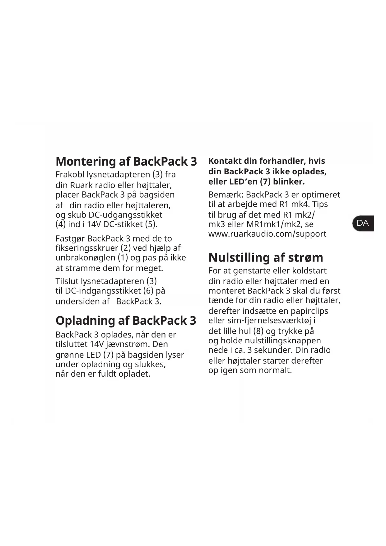 Montering af BackPack 3 Frakobl lysnetadapteren (3) fra din Ruark radio eller højttaler, placer BackPack 3 på bagsiden af din radio eller højttaleren, og skub DC-udgangsstikket (4) ind i 14V DC-stikket (5). Fastgør BackPack 3 med de to kseringsskruer (2) ved hjælp af unbrakonøglen (1) og pas på ikke at stramme dem for meget. Tilslut lysnetadapteren (3) til DC-indgangsstikket (6) på undersiden af BackPack 3. Opladning af BackPack 3 BackPack 3 oplades, når den er tilsluttet 14V jævnstrøm. Den grønne LED (7) på bagsiden lyser under opladning og slukkes, når den er fuldt opladet. Kontakt din forhandler, hvis din BackPack 3 ikke oplades, eller LED’en (7) blinker. Bemærk: BackPack 3 er optimeret til at arbejde med R1 mk4. Tips til brug af det med R1 mk2/ mk3 eller MR1mk1/mk2, se www.ruarkaudio.com/support Nulstilling af strøm For at genstarte eller koldstart din radio eller højttaler med en monteret BackPack 3 skal du først tænde for din radio eller højttaler, derefter indsætte en papirclips eller sim-fjernelsesværktøj i det lille hul (8) og trykke på og holde nulstillingsknappen nede i ca. 3 sekunder. Din radio eller højttaler starter derefter op igen som normalt.Sikkerhedsinformation INDEHOLDER LITHIUM ION-CELLER ● Man må aldrig forsøge at åbne batteripakken af nogen som helst grund. Hvis batteripakkens kabinet er revnet eller ødelagt, må det ikke monteres på en radio eller højttaler. Batteripakken må hverken knuses, tabes eller beskadiges. Man må ikke bruge en batteripakke, der er blevet tabt eller beskadiget på nogen måde. Beskadigede batteripakker skal returneres til servicecenter eller sendes til genanvendelse. ● Batteripakken må ikke brændes, selv ikke, hvis det er stærkt beskadiget eller helt udtjent. ● Hvis batteriindhold kommer i berøring med huden, skal det pågældende område omgående vaskes med mild sæbe og vand. ● Læs denne brugervejledning og følg alle vejledninger, det vil hjælpe dig med at opstille og bruge dit produkt korrekt. ● Følg alle advarsler og gem denne brugervejledning til fremtidig brug. ● Al servicering skal udføres af kvaliceret servicepersonale. ● Denne enhed er beregnet til KUN at blive drevet med de vekselspændinger, der er anført på enheden eller den medfølgende strømforsyning. Brug af andre strømspændinger end de anførte kan forårsage irreversibel skade på enheden og ugyldiggøre produktgarantien. ● Brug kun den strømforsyning, der leveres med den/de originale Ruark radio eller højttalere, eller et godkendt alternativ. ● Det skal sikres, at strømadapter, strømstik eller strømkonnektor ind i enheden er nemtEN