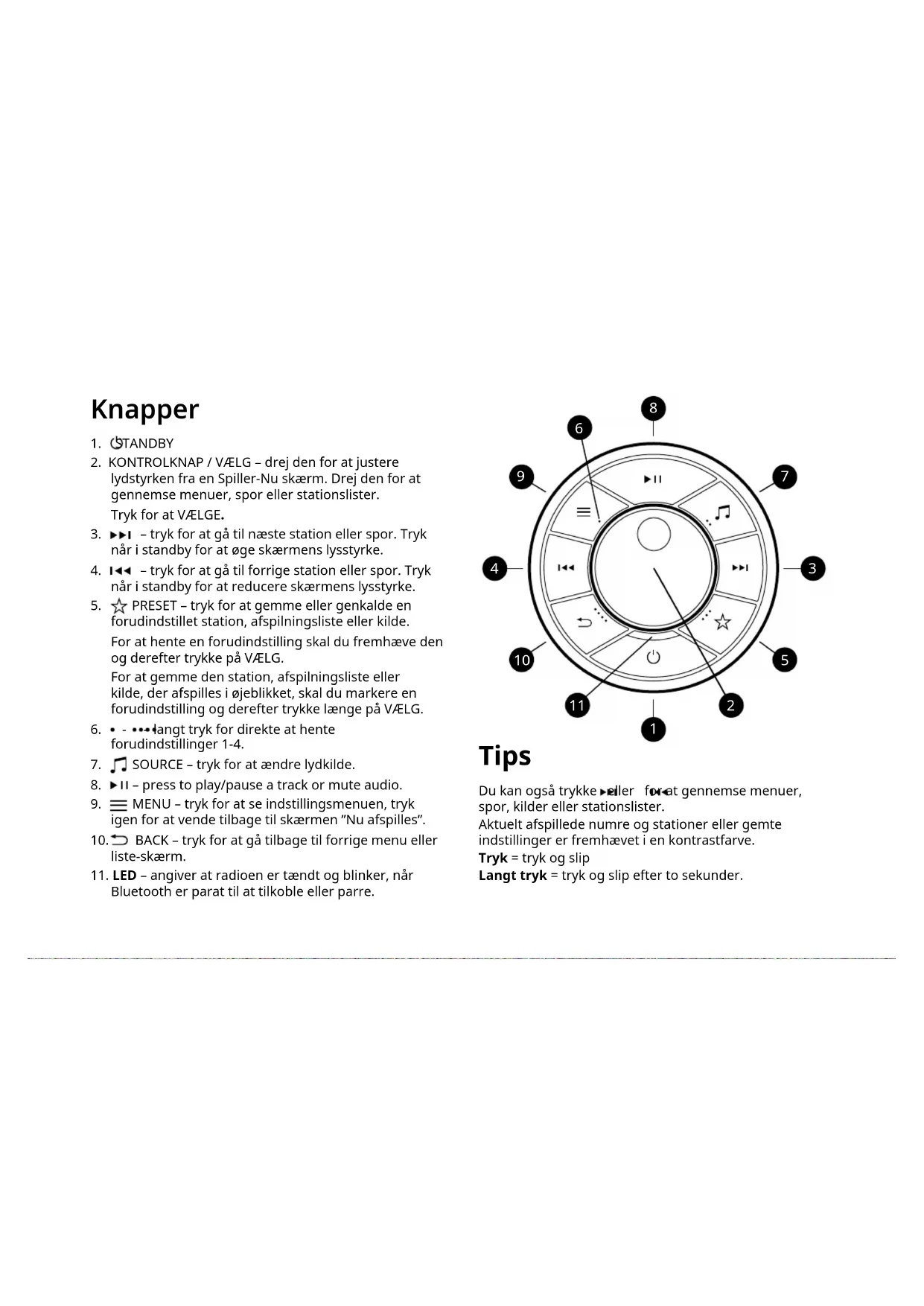 Bluetooth er parat til at tilkoble eller parre. Tips Du kan også trykke eller for at gennemse menuer, spor, kilder eller stationslister. Aktuelt afspillede numre og stationer eller gemte indstillinger er fremhævet i en kontrastfarve. Tryk = tryk og slip Langt tryk = tryk og slip efter to sekunder.