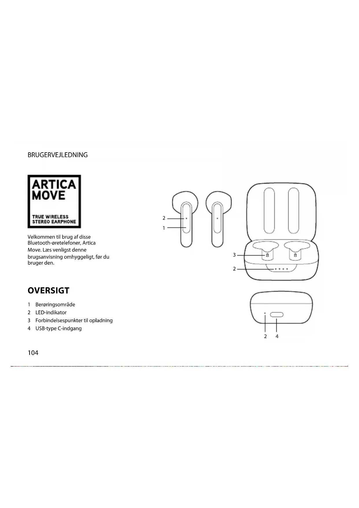 Velkommen til brug af disse Bluetooth-øretelefoner, Artica Move. Læs venligst denne brugsanvisning omhyggeligt, før du bruger den. OVERSIGT Berøringsområde LED-indikator Forbindelsespunkter til opladning USB-type C-indgang