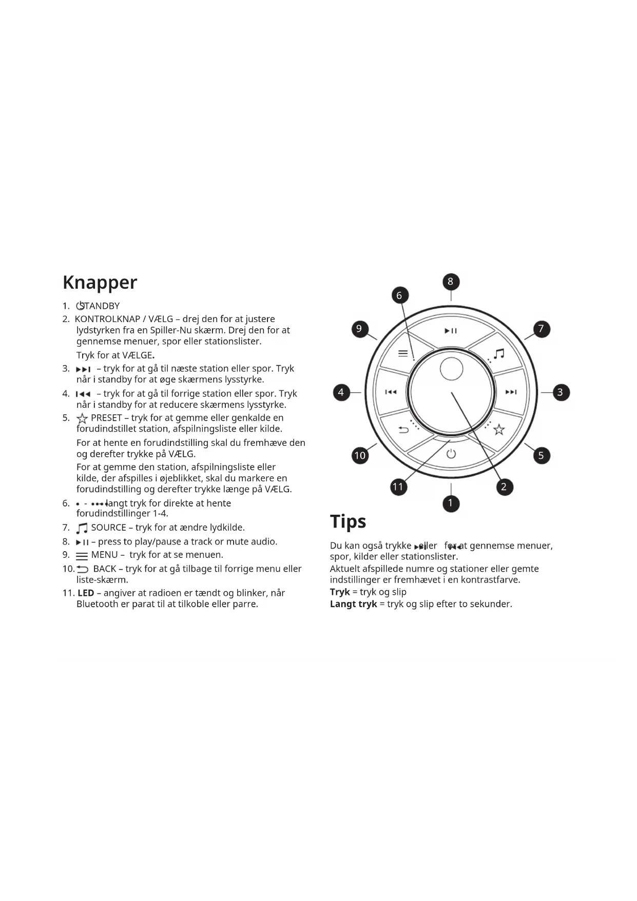 – tryk for at gå til næste station eller spor. Tryk når i standby for at øge skærmens lysstyrke.