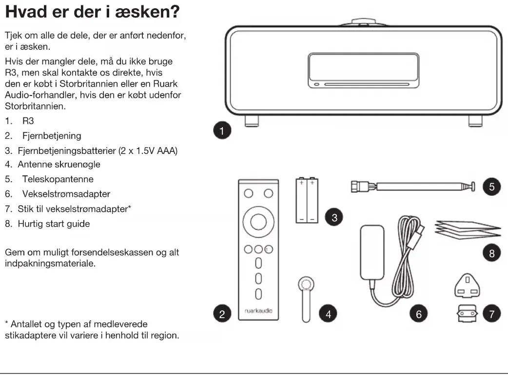 Brugervejledning● Læs denne brugervejledning og følg alle vejledninger, det vil hjælpe dig med at opstille og bruge dit produkt korrekt. ● Følg alle advarsler og gem denne brugervejledning til fremtidig brug. ● Man må ikke forsøge at bruge en beskadiget enhed, da det kan resultere i et farligt elektrisk stød. ● Man må ikke åbne enheden, eller afmontere paneler, så elektronikken afdækkes. Der er ingen dele indeni, som kan serviceres af brugeren. ● Al servicering skal udføres af kvaliceret servicepersonale. Servicering er påkrævet, hvis enheden er blevet beskadiget på nogen måde, som f.eks. hvis strømledningen eller -stikket er blevet beskadiget, der er spildt væske i, eller ting er faldet ned i, enheden, enheden er blevet udsat for regn eller fugtighed, hvis enheden ikke fungerer normalt eller den er blevet tabt. ● Denne enhed er beregnet til KUN at blive drevet med de vekselspændinger, der er anført på bagpanelet eller den medfølgende strømforsyning. Brug af andre strømspændinger end de anførte kan forårsage irreversibel skade på enheden og ugyldiggøre produktgarantien. ● Det skal sikres, at strømstik eller strømkonnektor ind i enheden er nemt tilgængelig i tilfælde af, at strømafbrydelse er påkrævet. ● Strømadapteren, strømstikket eller strømkonnektoren skal tages ud af stikkontakten for at frakoble systemet helt fra forsyningsnettet. ● Der må ikke placeres nogen form for åben ild, som f.eks. stearinlys, på eller tæt på enheden. Må ikke installeres tæt på varmekilder, som f.eks. radiatorer, brændeovne eller andre enheder (inklusive forstærkere), der frembringer varme. ● Undgå udsættelse for ekstrem varme eller kulde. ● Der må kun bruges udstyr/tilbehør, der er speciceret for enheden. Der må ikke udføres modikationer til systemet eller tilbehør. Uautoriserede ændringer kan kompromittere sikkerhed, overholdelse af lovgivning og systempræstation. ● Brug kun den medfølgende antenne eller en godkendt erstatning. ● For at reducere risikoen for brand eller elektrisk stød må apparatet ikke udsættes for regn eller fugt. Enheden må ikke udsættes for dryp eller stænk og man må ikke placere genstande fyldt med væske, som f.eks. vaser, på eller i nærheden af enheden. Som med alle elektroniske produkter, skal man være forsigtig med ikke at spilde væsker ned i nogen del af systemet. Væsker kan forårsage driftssvigt og/eller en brandfare. ● Træk enhedens stik ud af kontakten, når det lyner, eller når enheden ikke bruges i længere tid ad gangen for at forhindre skade på enheden. ● For at forebygge risiko for fare eller elektrisk stød skal man undgå at overbelaste stikkontakter, forlængerledninger eller stikkontakter samt integrerede stikdåser. ● Længerevarende udsættelse for høj musik kan forårsage høreskade. Det er bedst at undgå ekstrem lydstyrke, når man bruger hovedtelefoner, især i længere perioder. ● Enheden må ikke installeres i et mindre, lukket rum. Der skal altid være et mellemrum på mindst 10cm omkring enheden for at sikre ventilation og man skal sørge for, at gardiner eller andre genstande aldrig tildækker enhedens ventilationsåbninger. Denne enhed er afmærket i henhold til Europæisk direktiv 2012/19/EU om affald af elektrisk og elektronisk udstyr. Dette symbol angiver, at produktet eller dets batterier ikke må kasseres som almindeligt husholdningsaffald. Som alt andet elektrisk udstyr skal det kasseres i overensstemmelse med lokale bestemmelser. CE-OVERENSSTEMMELSESOPLYSNINGER Dette produkt overholder alle EU-direktivkrav i henhold til gældende lov. Hermed erklærer Ruark Audio, at denne enhed overholder de væsentlige krav og andre relevante bestemmelser i det europæiske radioudstyrdirektiv 2014/53/EU. Du kan downloade den fulde CE-overensstemmelseserklæring på www.ruarkaudio.com/doc/R3doc.pdf Sikkerheds- og lovgivningsmæssige oplysningerDA Specifikationer Forstærkere og drivere 2 x 75mm Ruark NS+ drivere 30W klasse AB effektforstærker Forbedret digital 3D-lydprocessor Tuner DAB, DAB+ og FM Tuner med RDS 75 Ohm F-type DAB/FM antennestik CD-afspiller CD, CD-ROM, CD-R/RW disks MP3, WMA, AAC up 320kbps Digital audio Internet radio, Spotify Connect, Amazon Music, Deezer, TIDAL, UPnP™ DLNA Wi-Fi 802.11b/g/n understøttet WEP-, WPA- og WPA2 MP3 48kHz 320kbps, AAC 96kHz 320kbps, FLAC 24-bit 48kHz, WAV 16-bit 48kHz / 24 bit 44.1kHz, WMA 44.1kHz 320kbps Bluetooth: V4.0 SBC, AAC, A2DP, aptX Indgange og udgange Digital optisk indgange (TOSLINK) 24-bit 192kHz Line indgang (RCA) 2.3Vrms Line udgang (RCA) 2.0Vrms Ethernet (RJ45) USB 2.0, 5W (5V 1A) 3,5mm hovedtelefonudgang, 25mW 16-32 Ohm 75Ω F-type DAB/FM Strøm Indgangseffekt 100-240VAC 50-60Hz 1A Udgangseffekt 14VDC 2.85A Nominelt forbrug: 5W Standbyforbrug: 1,6W Fjernbatteri: 2 x 1.5V AAA Fysisk H167 x W420 x D220mm 5.3kg Specikation og design kan ændres uden forudgående varsel. Ruark Audio påtager sig intet ansvar for fejl, der kan forekomme i denne manual og informationen heri kan ændres uden forudgående varsel. Fejlsøgning For hjælp med dit produkt henviser vi til OSS- (Ofte stillede spørgsmål (FAQ) siden på supportområdet på vores website. For yderligere information se www.ruarkaudio.com/supportHvad er der i æsken? Tjek om alle de dele, der er anført nedenfor, er i æsken. Hvis der mangler dele, må du ikke bruge R3, men skal kontakte os direkte, hvis den er købt i Storbritannien eller en Ruark Audio-forhandler, hvis den er købt udenfor Storbritannien.