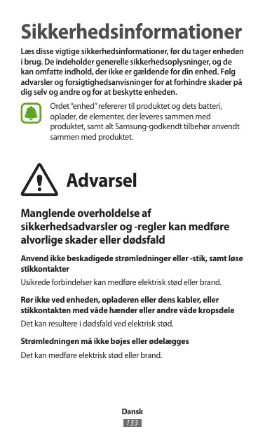 Sikkerhedsinformationer Læs disse vigtige sikkerhedsinformationer, før du tager enheden i brug. De indeholder generelle sikkerhedsoplysninger, og de kan omfatte indhold, der ikke er gældende for din enhed. Følg advarsler og forsigtighedsanvisninger for at forhindre skader på dig selv og andre og for at beskytte enheden. Ordet “enhed” refererer til produktet og dets batteri, oplader, de elementer, der leveres sammen med produktet, samt alt Samsung-godkendt tilbehør anvendt sammen med produktet.