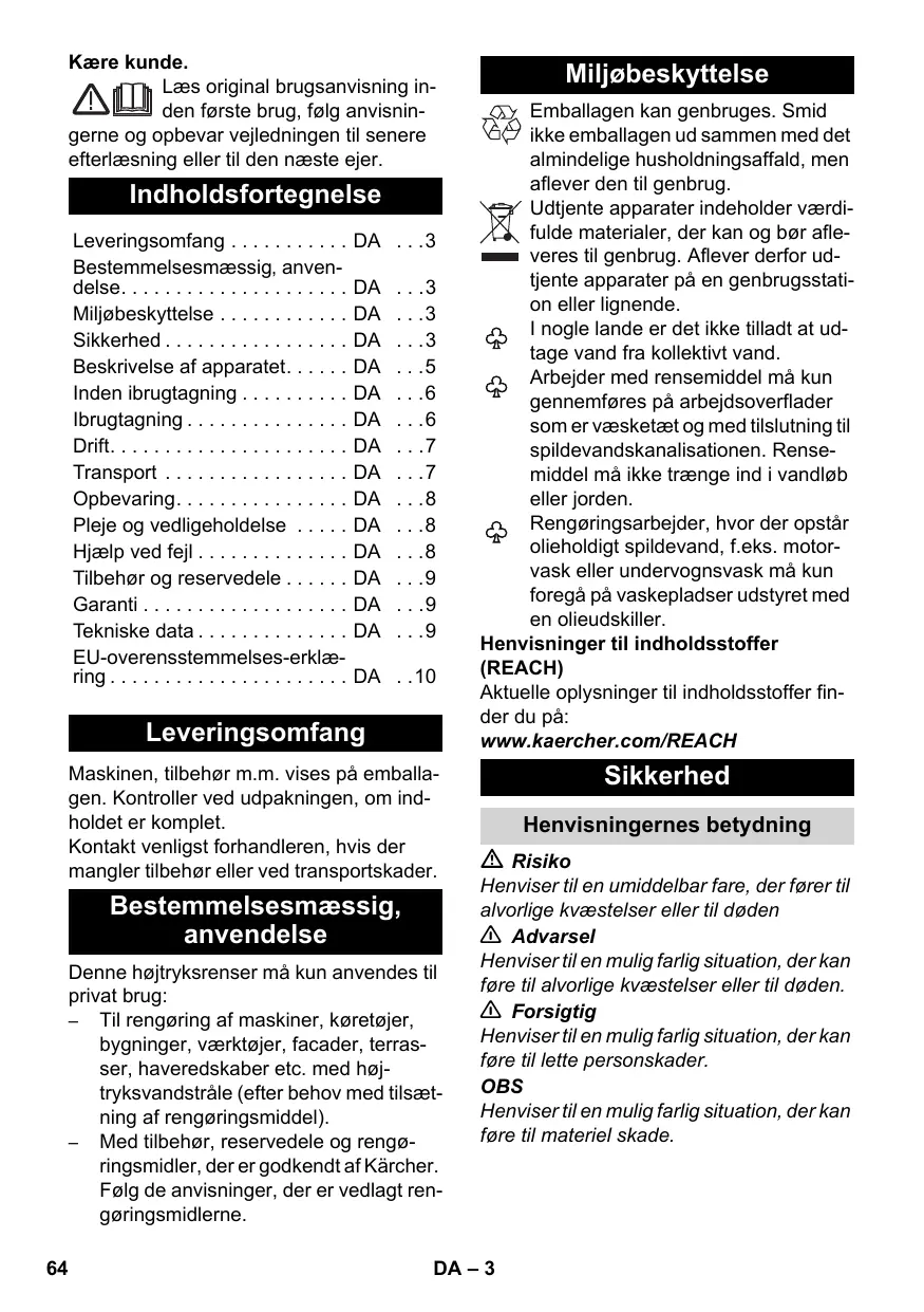 DA . .10 Leveringsomfang Maskinen, tilbehør m.m. vises på emballagen. Kontroller ved udpakningen, om indholdet er komplet. Kontakt venligst forhandleren, hvis der mangler tilbehør eller ved transportskader. Bestemmelsesmæssig‚ anvendelse Denne højtryksrenser må kun anvendes til privat brug: – Til rengøring af maskiner, køretøjer, bygninger, værktøjer, facader, terrasser, haveredskaber etc. med højtryksvandstråle (efter behov med tilsætning af rengøringsmiddel). – Med tilbehør, reservedele og rengøringsmidler, der er godkendt af Kärcher. Følg de anvisninger, der er vedlagt rengøringsmidlerne.