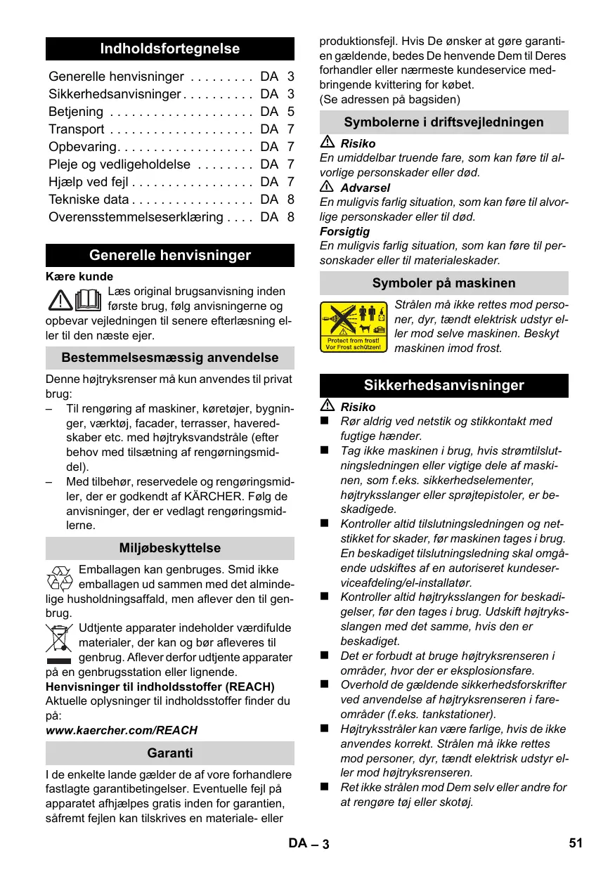 Generelle henvisninger produktionsfejl. Hvis De ønsker at gøre garantien gældende, bedes De henvende Dem til Deres forhandler eller nærmeste kundeservice medbringende kvittering for købet. (Se adressen på bagsiden) Symbolerne i driftsvejledningen Risiko En umiddelbar truende fare, som kan føre til alvorlige personskader eller død. 몇 Advarsel En muligvis farlig situation, som kan føre til alvorlige personskader eller til død. Forsigtig En muligvis farlig situation, som kan føre til personskader eller til materialeskader. Kære kunde Læs original brugsanvisning inden første brug, følg anvisningerne og opbevar vejledningen til senere efterlæsning eller til den næste ejer. Symboler på maskinen Strålen må ikke rettes mod personer, dyr, tændt elektrisk udstyr eller mod selve maskinen. Beskyt maskinen imod frost. Bestemmelsesmæssig anvendelse Denne højtryksrenser må kun anvendes til privat brug: – Til rengøring af maskiner, køretøjer, bygninger, værktøj, facader, terrasser, haveredskaber etc. med højtryksvandstråle (efter behov med tilsætning af rengørningsmiddel). – Med tilbehør, reservedele og rengøringsmidler, der er godkendt af KÄRCHER. Følg de anvisninger, der er vedlagt rengøringsmidlerne. Sikkerhedsanvisninger Risiko Rør aldrig ved netstik og stikkontakt med fugtige hænder. Tag ikke maskinen i brug, hvis strømtilslut-