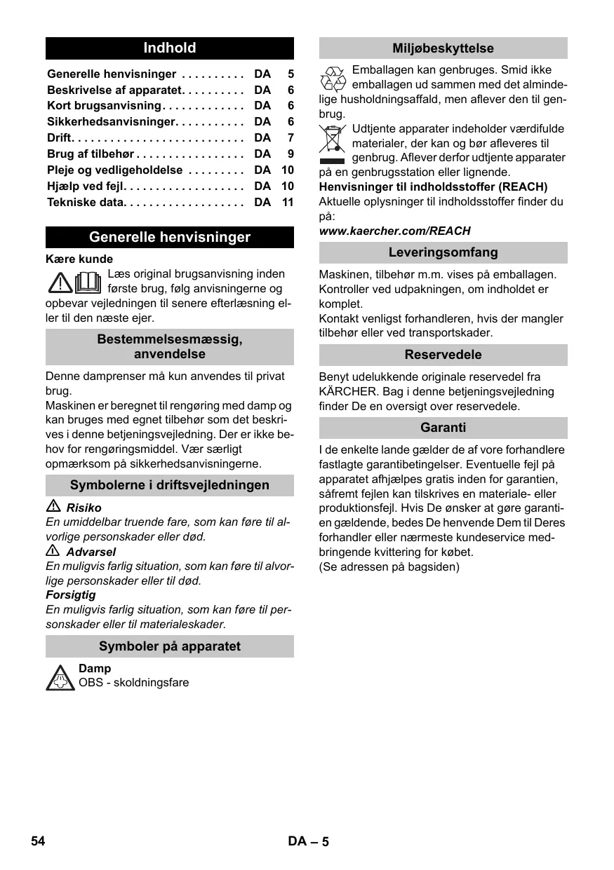 Indhold Generelle Danskhenvisninger . . . . . . . . . . Beskrivelse af apparatet. . . . . . . . . . Kort brugsanvisning. . . . . . . . . . . . . Sikkerhedsanvisninger. . . . . . . . . . . Drift. . . . . . . . . . . . . . . . . . . . . . . . . . . Brug af tilbehør . . . . . . . . . . . . . . . . . Pleje og vedligeholdelse . . . . . . . . . Hjælp ved fejl. . . . . . . . . . . . . . . . . . . Tekniske data. . . . . . . . . . . . . . . . . . . Miljøbeskyttelse DA 5 DA 6 DA 6 DA 6 DA 7 DA 9 DA 10 DA 10 DA 11 Generelle henvisninger Kære kunde Læs original brugsanvisning inden første brug, følg anvisningerne og opbevar vejledningen til senere efterlæsning eller til den næste ejer. Bestemmelsesmæssig‚ anvendelse Leveringsomfang Maskinen, tilbehør m.m. vises på emballagen. Kontroller ved udpakningen, om indholdet er komplet. Kontakt venligst forhandleren, hvis der mangler tilbehør eller ved transportskader. Reservedele Denne damprenser må kun anvendes til privat brug. Maskinen er beregnet til rengøring med damp og kan bruges med egnet tilbehør som det beskrives i denne betjeningsvejledning. Der er ikke behov for rengøringsmiddel. Vær særligt opmærksom på sikkerhedsanvisningerne. Symbolerne i driftsvejledningen Risiko Emballagen kan genbruges. Smid ikke emballagen ud sammen med det almindelige husholdningsaffald, men aflever den til genbrug. Udtjente apparater indeholder værdifulde materialer, der kan og bør afleveres til genbrug. Aflever derfor udtjente apparater på en genbrugsstation eller lignende. Henvisninger til indholdsstoffer (REACH) Aktuelle oplysninger til indholdsstoffer finder du på: www.kaercher.com/REACH En umiddelbar truende fare, som kan føre til alvorlige personskader eller død. 몇 Advarsel En muligvis farlig situation, som kan føre til alvorlige personskader eller til død. Forsigtig En muligvis farlig situation, som kan føre til personskader eller til materialeskader. Benyt udelukkende originale reservedel fra KÄRCHER. Bag i denne betjeningsvejledning finder De en oversigt over reservedele. Garanti I de enkelte lande gælder de af vore forhandlere fastlagte garantibetingelser. Eventuelle fejl på apparatet afhjælpes gratis inden for garantien, såfremt fejlen kan tilskrives en materiale- eller produktionsfejl. Hvis De ønsker at gøre garantien gældende, bedes De henvende Dem til Deres forhandler eller nærmeste kundeservice medbringende kvittering for købet. (Se adressen på bagsiden) Symboler på apparatet Damp OBS - skoldningsfare