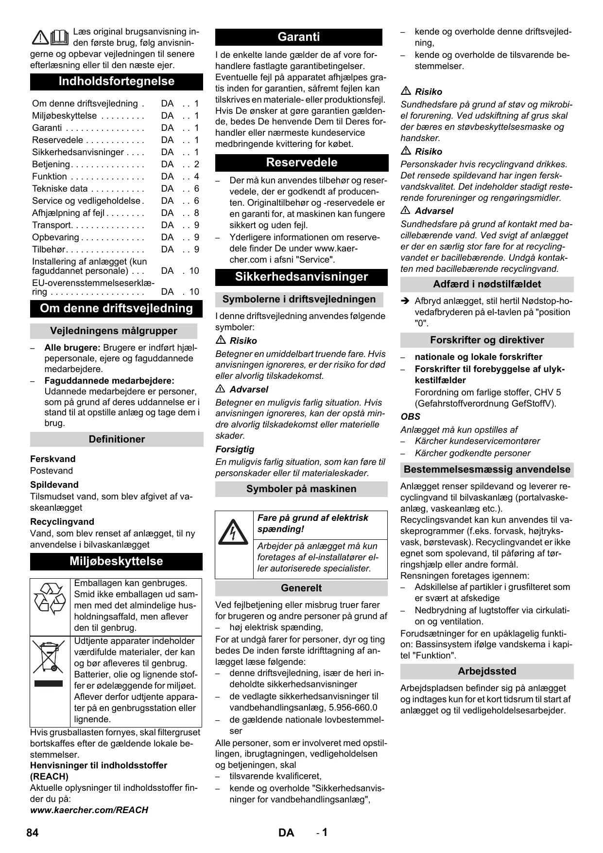 Alle brugere: Brugere er indført hjælpepersonale, ejere og faguddannede medarbejdere. Faguddannede medarbejdere: Udannede medarbejdere er personer, som på grund af deres uddannelse er i stand til at opstille anlæg og tage dem i brug. Definitioner Ferskvand Postevand Spildevand Tilsmudset vand, som blev afgivet af vaskeanlægget Recyclingvand Vand, som blev renset af anlægget, til ny anvendelse i bilvaskanlægget Miljøbeskyttelse Emballagen kan genbruges. Smid ikke emballagen ud sammen med det almindelige husholdningsaffald, men aflever den til genbrug. Udtjente apparater indeholder værdifulde materialer, der kan og bør afleveres til genbrug. Batterier, olie og lignende stoffer er ødelæggende for miljøet. Aflever derfor udtjente apparater på en genbrugsstation eller lignende. Hvis grusballasten fornyes, skal filtergruset bortskaffes efter de gældende lokale bestemmelser. Henvisninger til indholdsstoffer (REACH) Aktuelle oplysninger til indholdsstoffer finder du på: www.kaercher.com/REACH