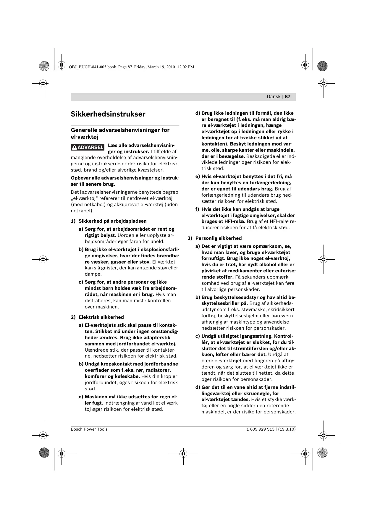 le. Dansk | 87 d) Brug ikke ledningen til formäl, den ikke er beregnet til (f.eks. mä man aldrig bæ- re el-værktajet i ledningen, hænge el-værktojet op i ledningen eller rykke i ledningen for at trække stikket ud af kontakten). Beskyt ledningen mod var- me, olie, skarpe kanter eller maskindele, der er i bevægelse. Beskadigede eller ind- viklede ledninger ager risikoen for elek- trisk stod. €) Hvis el-værktajet benyttes i det fri, mà der kun benyttes en forlængerledning, der er egnet til udendors brug. Brug af forlængerledning til udendors brug ned- sætter risikoen for elektrisk stod. f) Hvis det ikke kan undgäs at bruge elværktajet i fugtige omgivelser, skal der bruges et HFt-relæ. Brug af et HFrelæ re- ducerer risikoen for at fä elektrisk stod. Personlig sikkerhed a) Det er vigtigt at være opmærksom, se, hvad man laver, og bruge el-værktojet fornuftigt. Brug ikke noget el-værktoi, hvis du er træt, har nydt alkohol eller er pävirket af medikamenter eller euforise- rende stoffer. Fâ sekunders uopmærk- somhed ved brug af el-værktojet kan fore til alvorlige personskader. b) Brug beskyttelsesudstyr og hav altid be- skyttelsesbriller pä. Brug af sikkerheds- udstyr som f.eks. stevmaske, skridsikkert fodtej, beskyttelseshjelm eller hareværn afhængig af maskintype og anvendelse nedsætter risikoen for personskader. €) Undgä utilsigtet igangsætning. Kontrol- lér, at ekværktojet er slukket, for du til- slutter det til stremtilforslen og/eller ak- kuen, lefter eller bærer det. Undgä at bære el-værktojet med fingeren pà afbry- deren og sorg for, at el-værktajet ikke er tændt, nâr det sluttes til nettet, da dette ager risikoen for personskader. d) Ger det til en vane altid at fjerne indstil- lingsværktoj eller skruenogle, for el-værktojet tændes. Hvis et stykke værk- toj eller en nogle sidder i en roterende maskindel, er der risiko for personskader. Bosch Power Tools Lis 1 609 929 813 | (19.3.10)