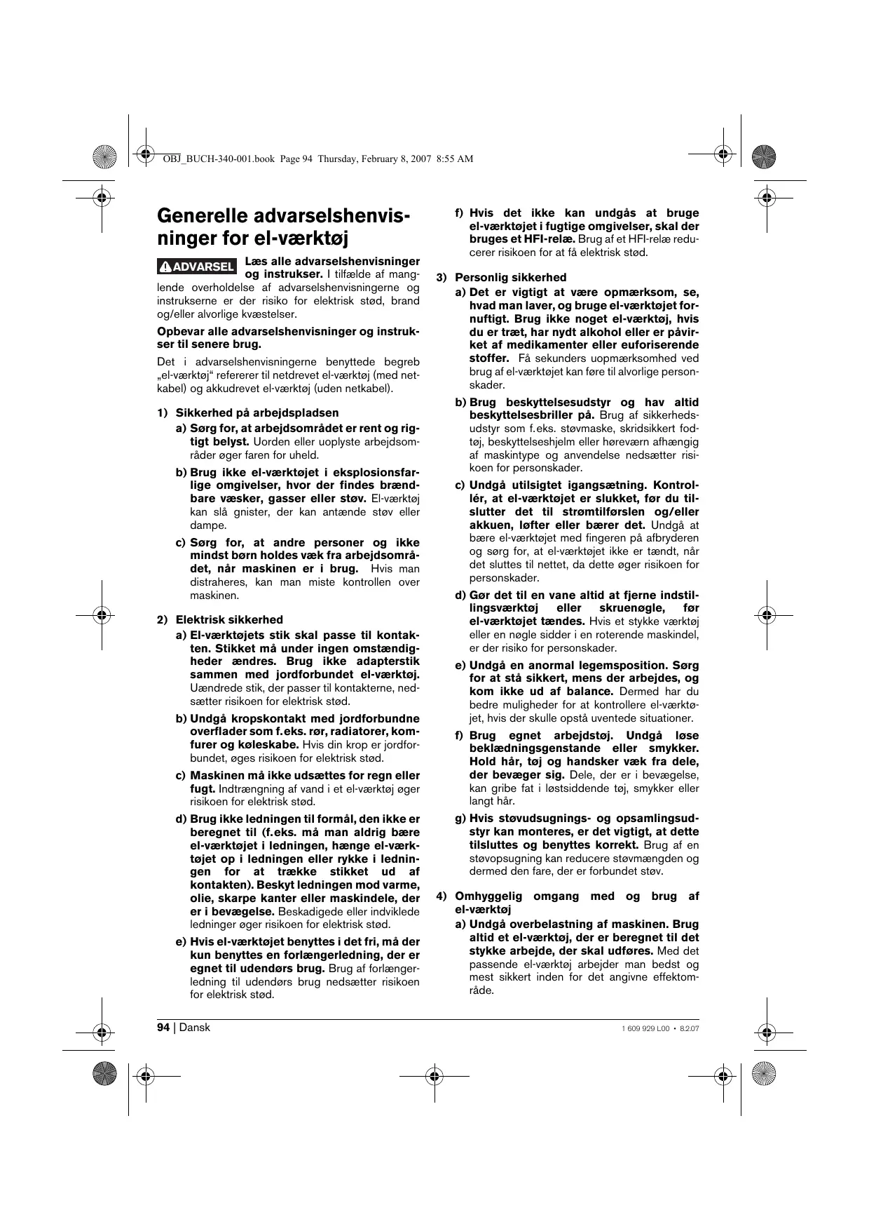 el-værktøj a) Undgå overbelastning af maskinen. Brug altid et el-værktøj, der er beregnet til det stykke arbejde, der skal udføres. Med det passende el-værktøj arbejder man bedst og mest sikkert inden for det angivne effektområde. 1 609 929 L00 • 8.2.07 OBJ_BUCH-340-001.book Page 95 Thursday, February 8, 2007 8:55 AM b) Brug ikke et el-værktøj, hvis afbryder er defekt. Et el-værktøj, der ikke kan startes og stoppes, er farlig og skal repareres. f Dette el-værktøj er ikke egnet til polering. Anvendelse af el-værktøjet til formål, det ikke er beregnet til, er forbundet med farer og kvæstelser. c) Træk stikket ud af stikkontakten og/eller fjern akkuen, inden maskinen indstilles, der skiftes tilbehørsdele, eller maskinen lægges fra. Disse sikkerhedsforanstaltninger forhindrer utilsigtet start af el-værktøjet. f Anvend kun tilbehør, hvis det er beregnet til dette el-værktøj og anbefalet af fabrikanten. En mulig fastgørelse af tilbehøret til el-værktøjet sikrer ikke en sikker anvendelse. d) Opbevar ubenyttet el-værktøj uden for børns rækkevidde. Lad aldrig personer, der ikke er fortrolige med maskinen eller ikke har gennemlæst disse instrukser, benytte maskinen. El-værktøj er farligt, hvis det benyttes af ukyndige personer. e) El-værktøjet bør vedligeholdes omhyggeligt. Kontroller, om bevægelige maskindele fungerer korrekt og ikke sidder fast, og om delene er brækket eller beskadiget, således at el-værktøjets funktion påvirkes. Få beskadigede dele repareret, inden maskinen tages i brug. Mange uheld skyldes dårligt vedligeholdte el-værktøjer. f) Sørg for, at skæreværktøjer er skarpe og rene. Omhyggeligt vedligeholdte skæreværktøjer med skarpe skærekanter sætter sig ikke så hurtigt fast og er nemmere at føre. g) Brug el-værktøj, tilbehør, indsatsværktøj osv. iht. disse instrukser. Tag hensyn til arbejdsforholdene og det arbejde, der skal udføres. Anvendelse af el-værktøjet til formål, som ligger uden for det fastsatte anvendelsesområde, kan føre til farlige situationer.