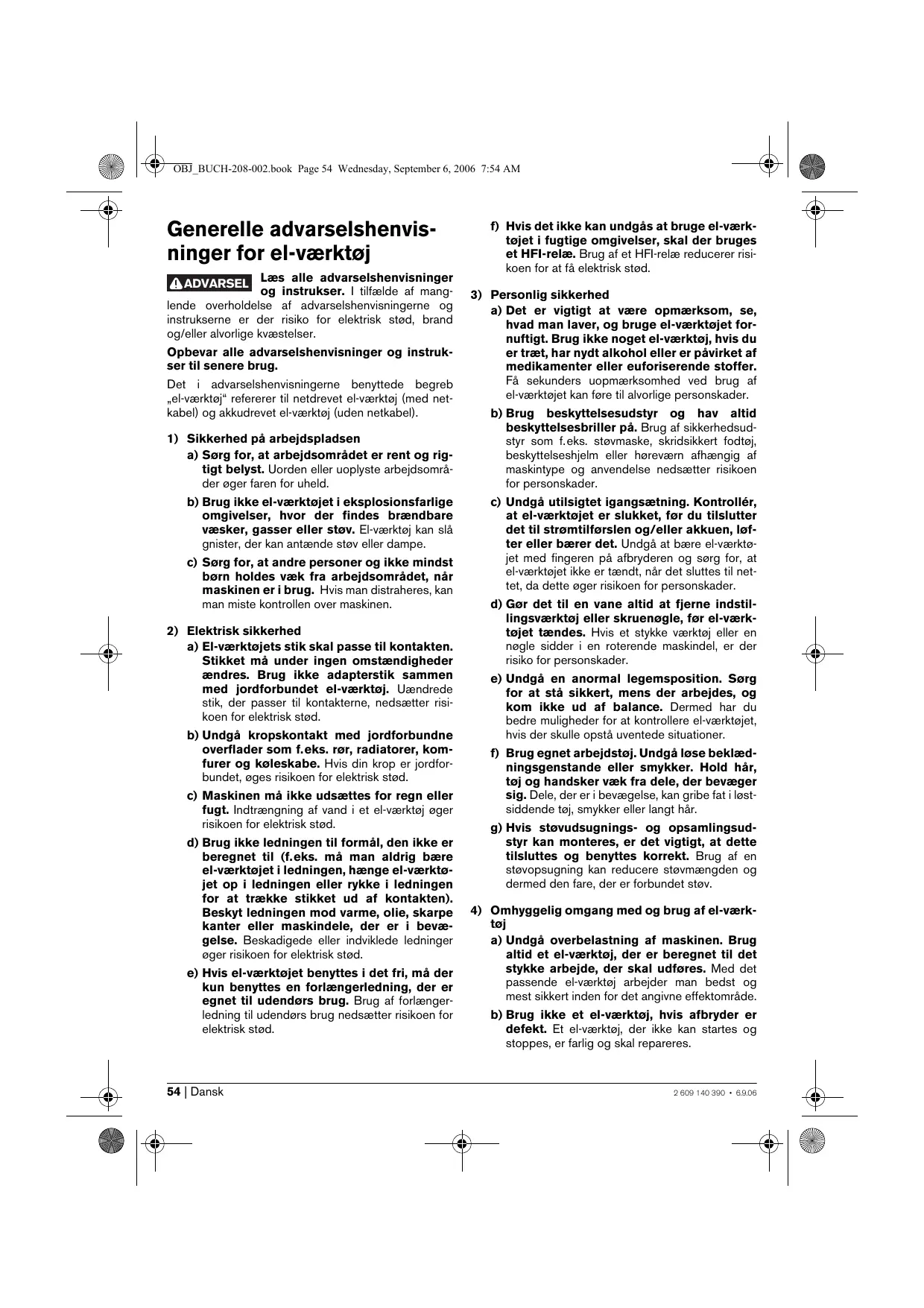 a) Undgå overbelastning af maskinen. Brug altid et el-værktøj, der er beregnet til det stykke arbejde, der skal udføres. Med det passende el-værktøj arbejder man bedst og mest sikkert inden for det angivne effektområde. b) Brug ikke et el-værktøj, hvis afbryder er defekt. Et el-værktøj, der ikke kan startes og stoppes, er farlig og skal repareres. 2 609 140 390 • 6.9.06 OBJ_BUCH-208-002.book Page 55 Wednesday, September 6, 2006 7:54 AM c) Træk stikket ud af stikkontakten og/eller fjern akkuen, inden maskinen indstilles, der skiftes tilbehørsdele, eller maskinen lægges fra. Disse sikkerhedsforanstaltninger forhindrer utilsigtet start af el-værktøjet.